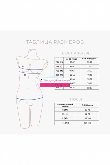 Размеры: бюст - 75А (XS), 75В (S), 75С (М), 80В (М), 80С (L), 80D (L), 85В (XL).