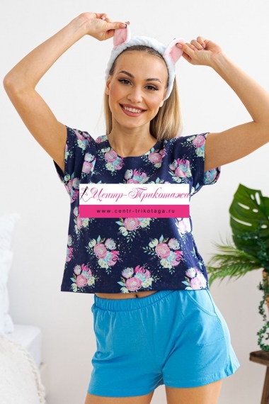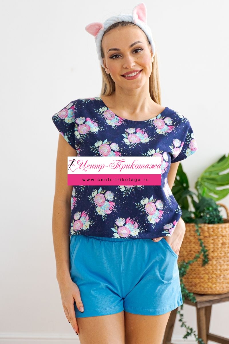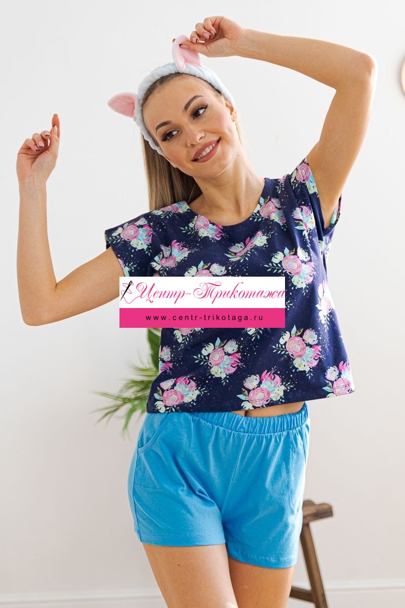 Комплект женский из футболки со спущенным плечом и шорт Fairy-tale цветы на темно-синем №А-D-0207