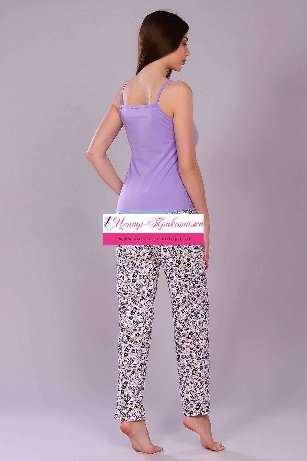 Костюм женский с брюками. Данная модель выполнена из трикотажного полотна кулирка (хлопок 100%). Майка на тонких бретелях, на полочке присутствует принт. Брюки свободного покроя с боковыми карманами и вшивным поясом. Отличная модель для домашнего отдыха.