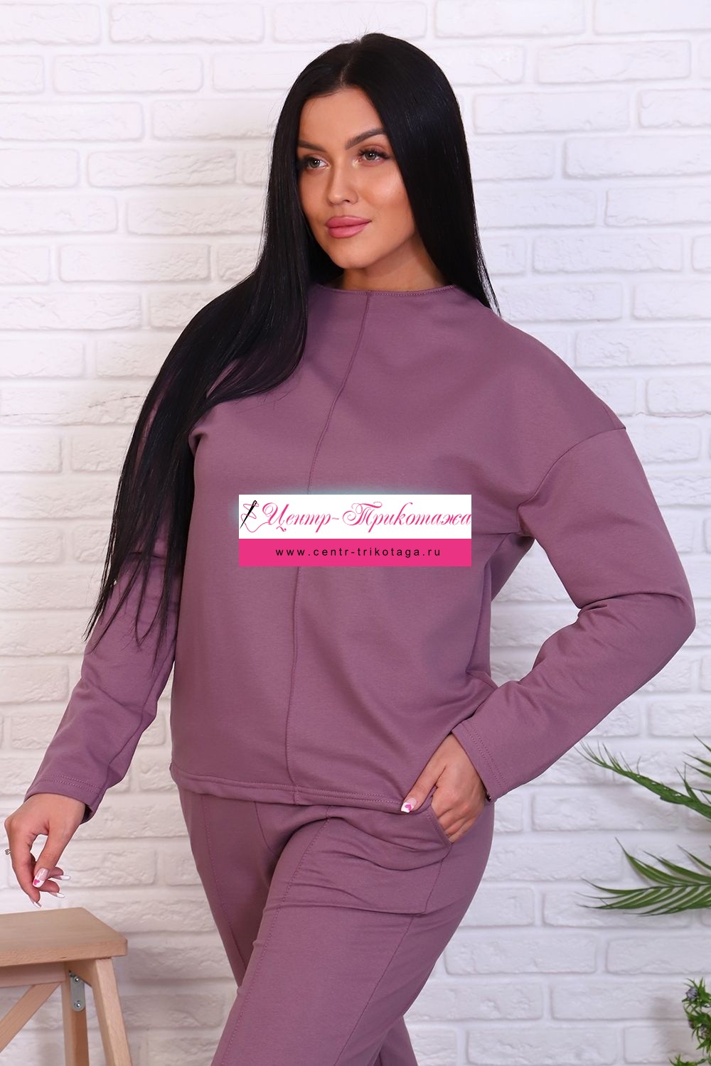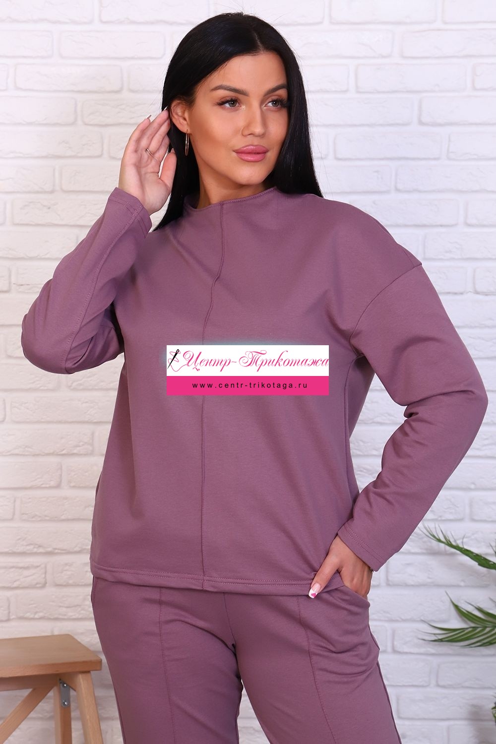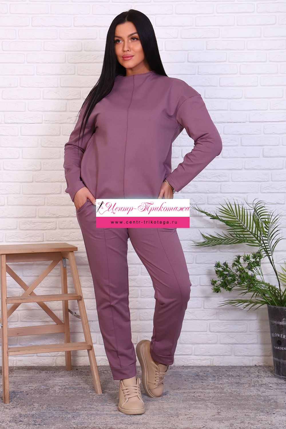 Стильный базовый костюм из хлопкового трикотажа отличного качества. Брюки прямого кроя, зауженные к низу, высокая посадка с простроченными стрелками, низ без резинки(не режет ногу), карманы в швах. Трикотажный джемпер длиной до середины бедра. По центру переда декоративный вертикальный защип вытягивает и стройнит. Горловина джемпера с цельнокроеной стойкой, обработана притачной обтачкой. Рукава джемпера длинный двухшовный, рубашечного кроя, линия плеча спущена. Полные размеры