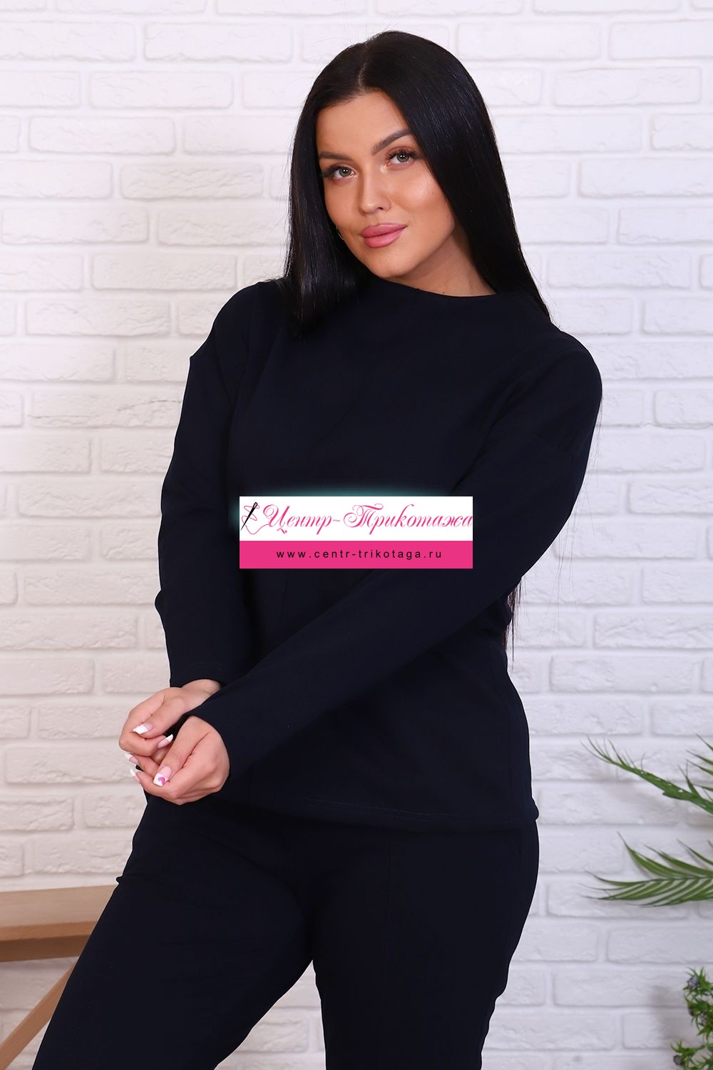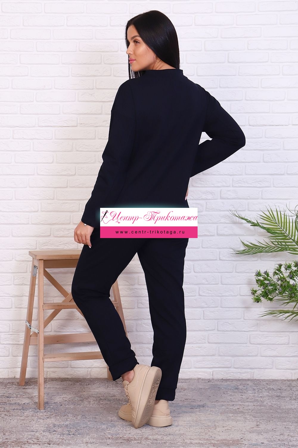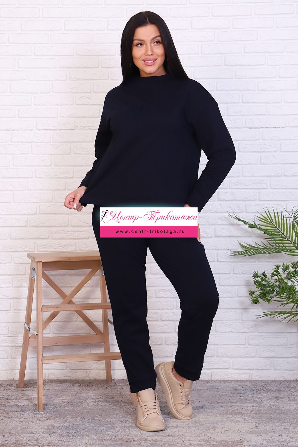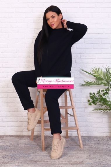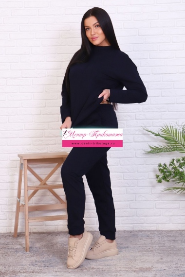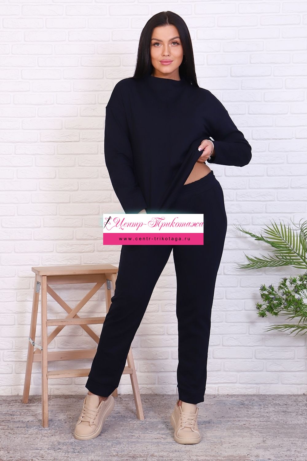 Стильный базовый костюм из хлопкового трикотажа отличного качества. Брюки прямого кроя, зауженные к низу, высокая посадка с простроченными стрелками, низ без резинки(не режет ногу), карманы в швах. Трикотажный джемпер длиной до середины бедра. По центру переда декоративный вертикальный защип вытягивает и стройнит. Горловина джемпера с цельнокроеной стойкой, обработана притачной обтачкой. Рукава джемпера длинный двухшовный, рубашечного кроя, линия плеча спущена. Полные размеры
