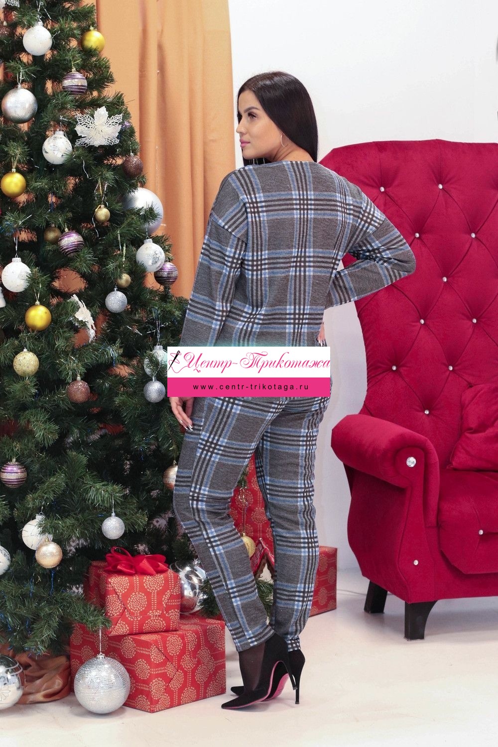 Костюм-двойка, состоящий из свободного жакета и брюк. Жакет прямого кроя с разрезами по бокам, без пуговиц и застежек, с длинным рукавом. Ткань теплая, плотная, мягкая, смесовая. Костюм удобный, легкий, теплый, комфортный, совершенно не сковывающий движений.