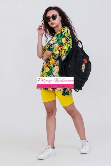 Яркий летний комплект для дома и отдыха. Состоит из объёмной длинной футболки с широкими рукавами и велосипедок. Велосипедки изготовлены из натурального хлопка с лайкрой, на широкой резинке, до середины бедра, не сдавливают, удобно прилегают. Фасон подходит для всех типов фигуры. Горловина округлой формы обработана втачной планкой. Длина рукава указана от основания шеи. В измерениях велосипедок указаны стандартные размеры фигуры. До этих значений велосипедки растягиваются без проблем. Яркий принт на футболке создаст летнее настроение.