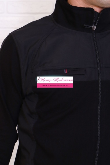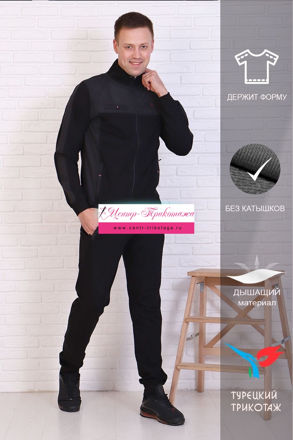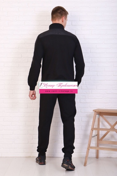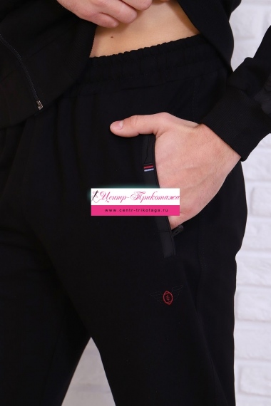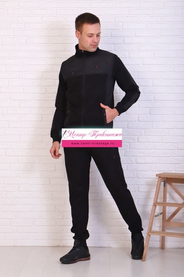 Мужской костюм спортивного плана. Кофта и карманы по бокам на молнии, сверху карман - обманка. На рукавах, по бокам кофты и сверху - вставка из плащевки. Воротник - стойка, рукава и низ кофты на манжетах. Брюки на манжетах, карманы на молнии, с декоративной листочкой. Сбоку на брюках и толстовке вышивная надпись.