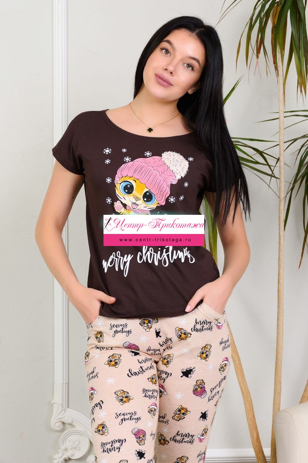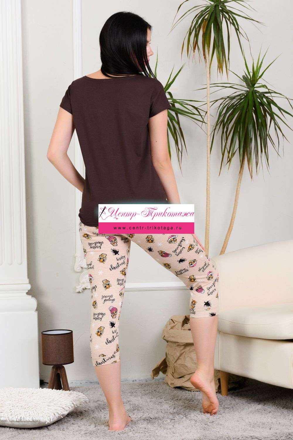 Молодёжный костюм с ярким принтом с изображением символа 2022 года. Футболка слегка приталенного силуэта, горловина в виде лодочки, спущенная пройма. Бриджи на распошитом притачном поясе, с удобными карманами по бокам, низ обработан манжетами. Костюм домашний, комфортный, из натурального 100% хлопка.