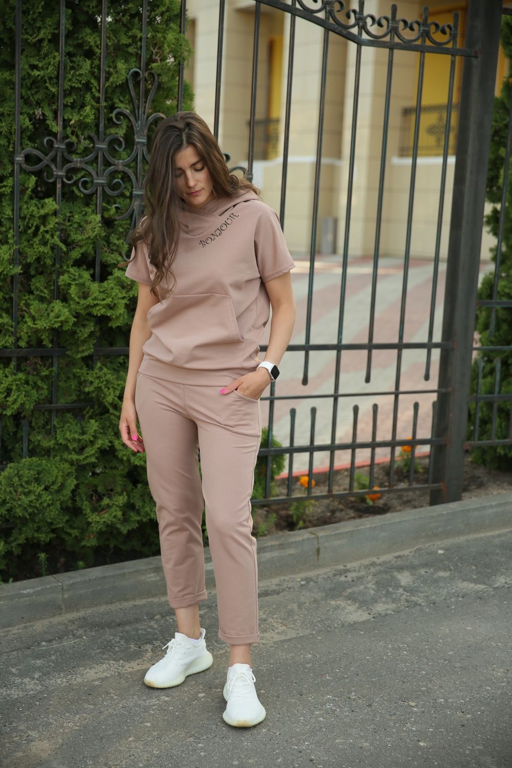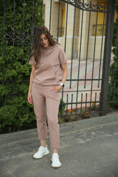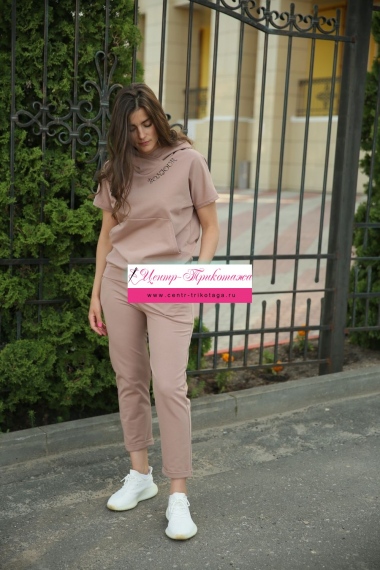 Молодежный костюм с капюшоном. Кофта свободного кроя, карман кенгуру. Неброская печать возле капюшона. Рукав спущенный. Брюки укороченные с манжетом. Карман с подкроенным бочком. Модный стильный костюмчик на любой вкус.
