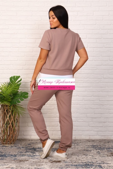 Костюм женский трикотажный - футболка и брюки. Футболка укороченная с отделкой по низу контрастного цвета. Брюки с завязками и втачными боковыми карманами. На футболке и брюки небольшие отделочные печати.