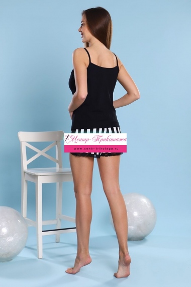 Молодежный костюм из кулирки майка + шорты. Майка однотонная черная на бретельках, кружевная отделка, шорты запашные из полосатой ткани, обработанные кружевом