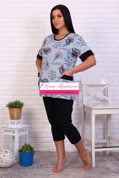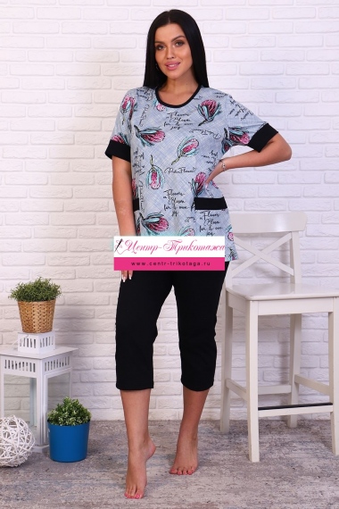 Женский костюм из кулирки футболка + бриджи. Футболка из набивной ткани с короткими рукавами на манжетах, сбоку два накладных кармана, бриджи из однотонной ткани