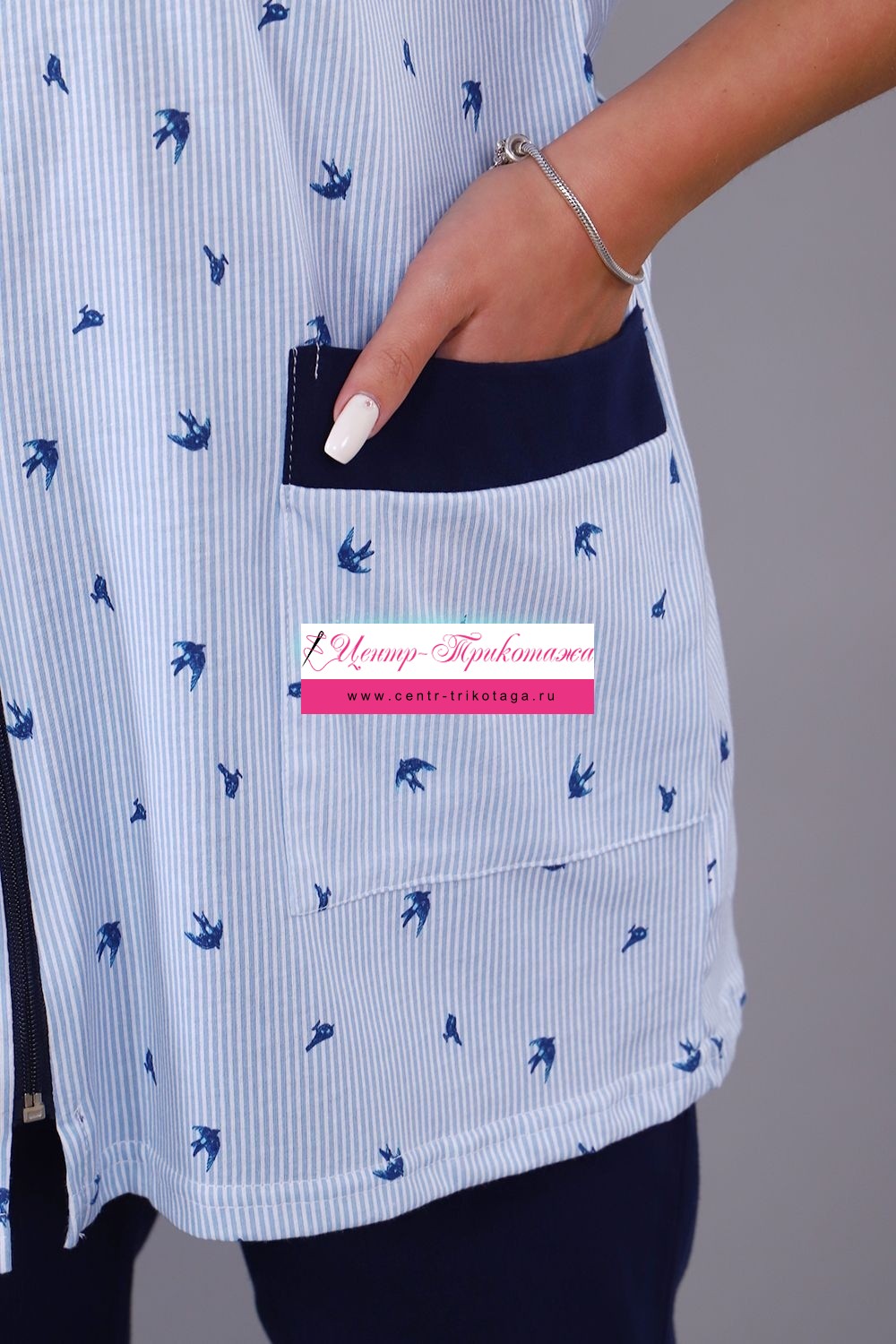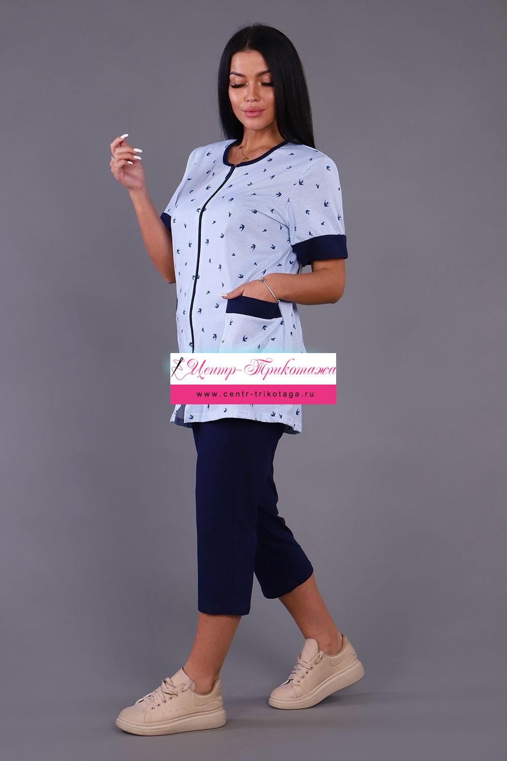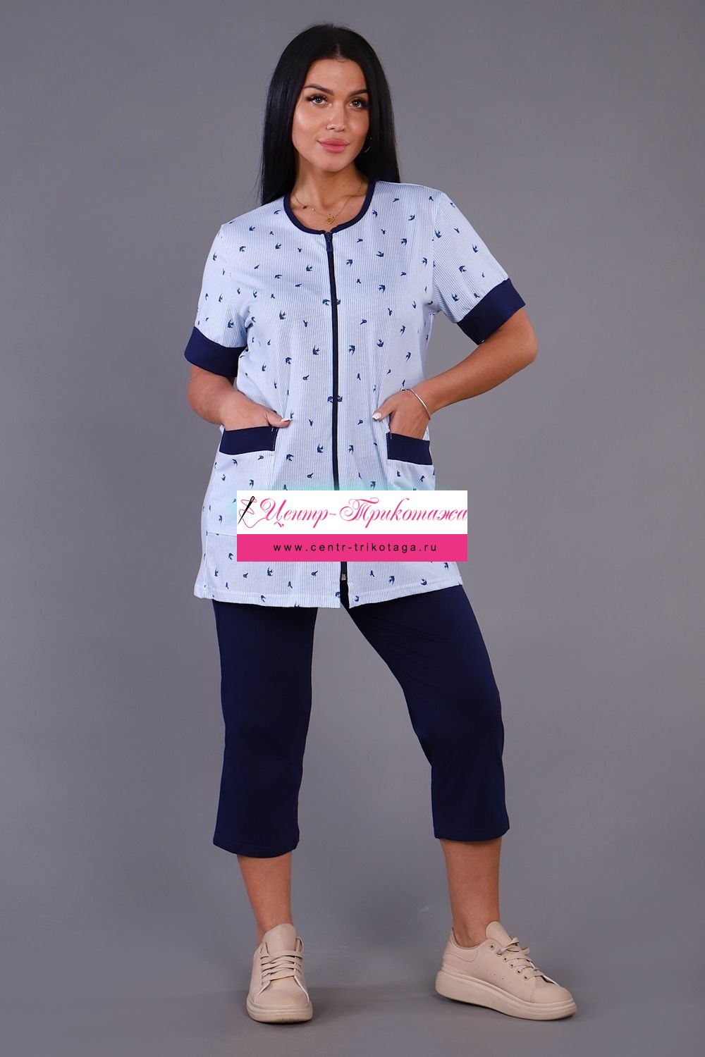Женский костюм из кулирки футболка + бриджи. Футболка из набивной ткани на молнии с накладными карманами, короткие рукава с манжетами, бриджи из однотонной ткани. Идеальный костюм для отдыха дома, на даче.