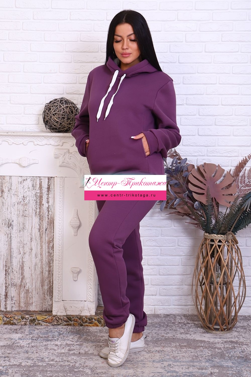 Костюм женский из футера 3-х нитки с начесом, качество пенье, что придает костюму еще больше комфорта и тепла. Кофта свободного кроя с капюшоном, карманы прорезные обработаны обтачкой. Пояс на резинке из кашкорсе. Брюки с карманами, пояс на резинке 4 см из кашкосе, низ брюк обработан резинкой под загиб.