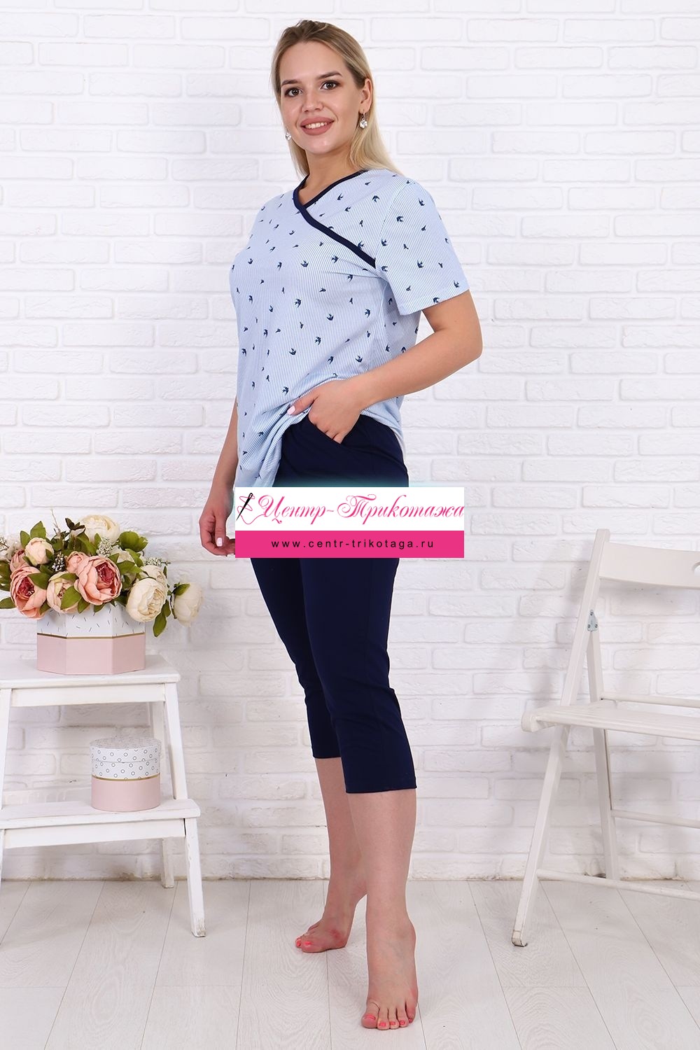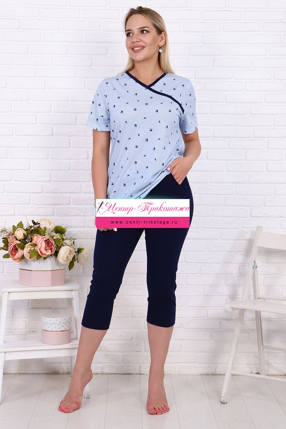 Женский костюм из кулирки футболка + бриджи. Футболка из набивной ткани с цветами, короткие рукава с манжетами, бриджи из однотонной ткани с карманами