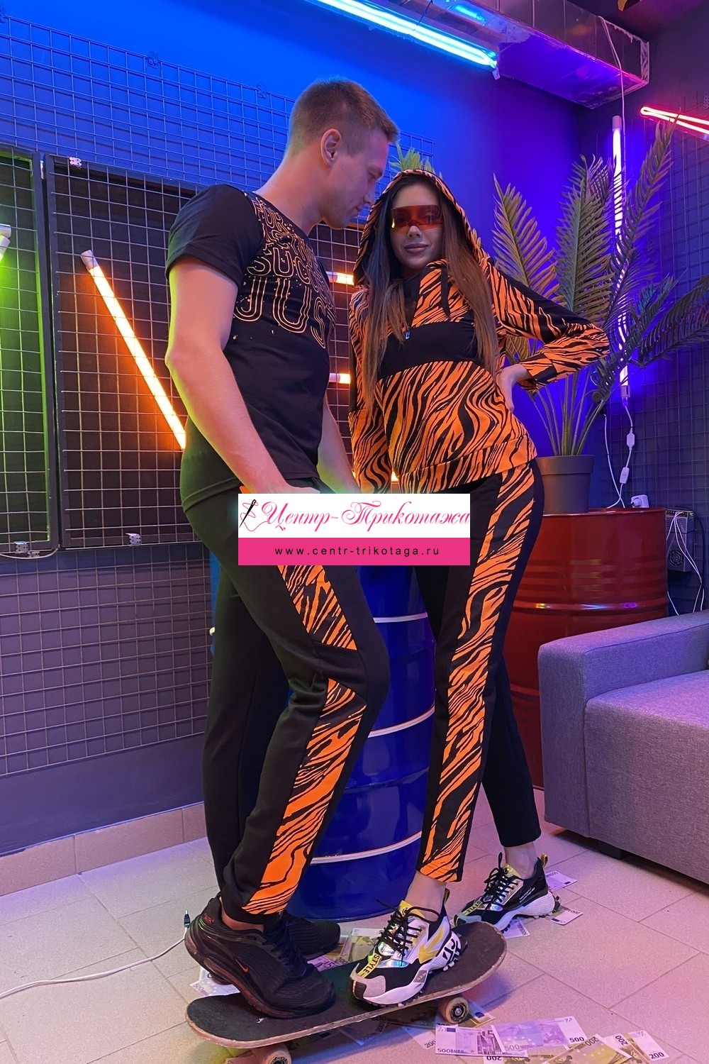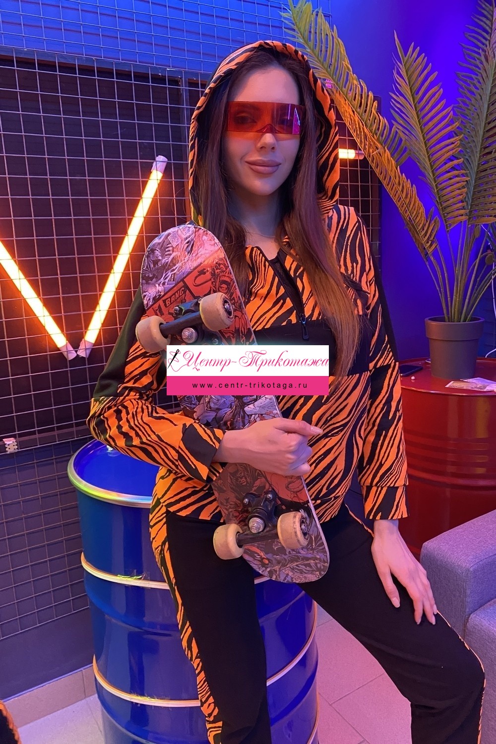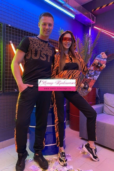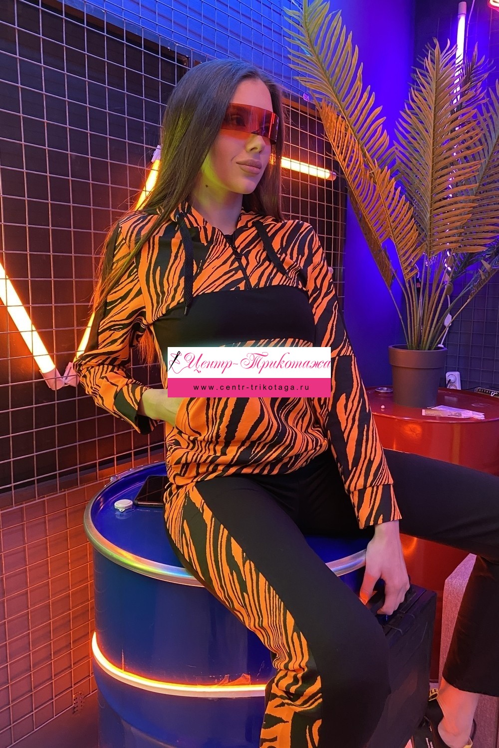 Костюм состоит из куртки и брюк. Брюки на поясе, с карманами, с лампасами из отделочного полотна вдоль боковых швов. Куртка свободная, с капюшоном, длиной до середины бедра, на поясе. Рукав втачной, длинный, со вставками из отделочного полотна, на манжете. На полочке расположен карман кенгуру . В верхней части полочки обработана молния и вставлена сетка.