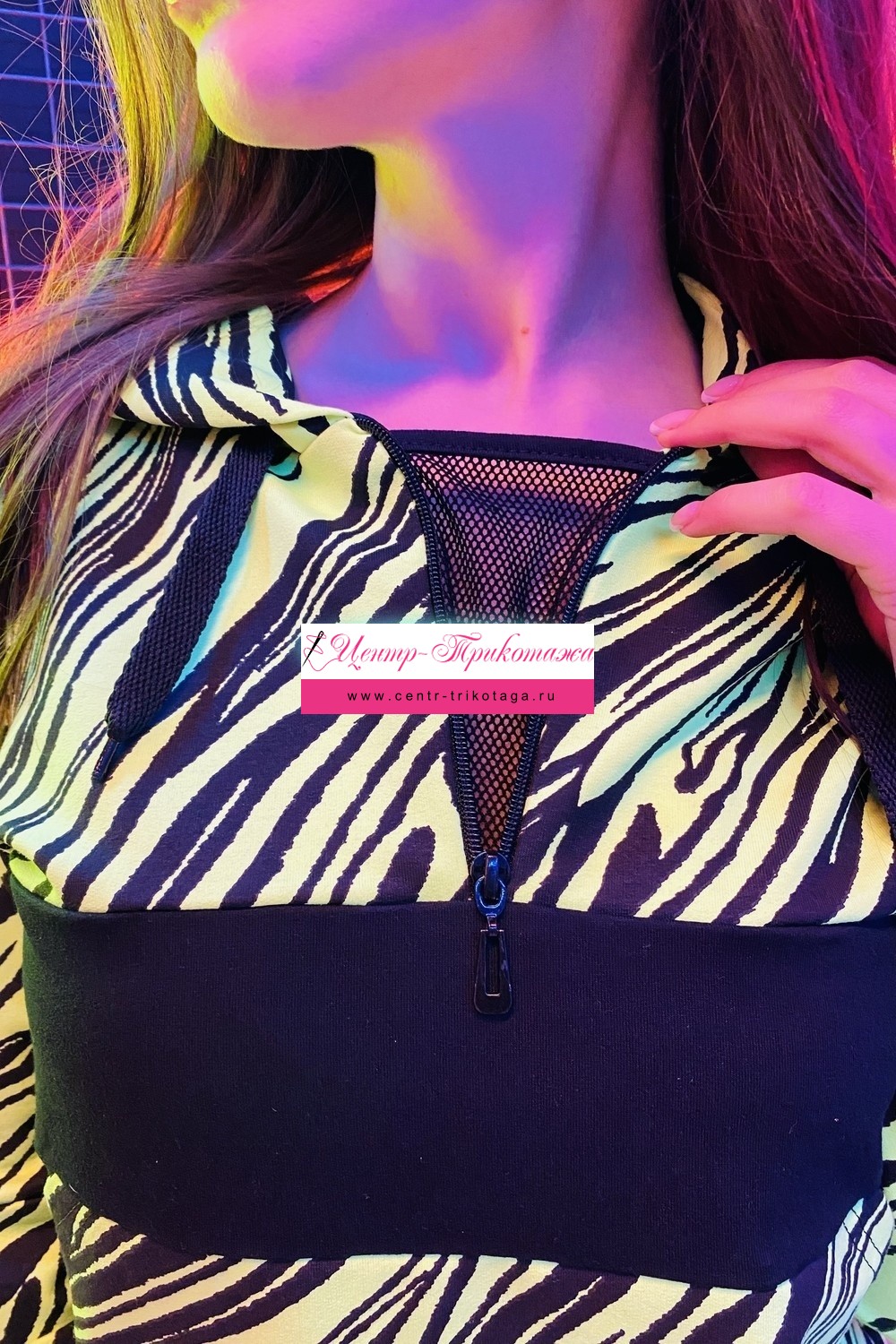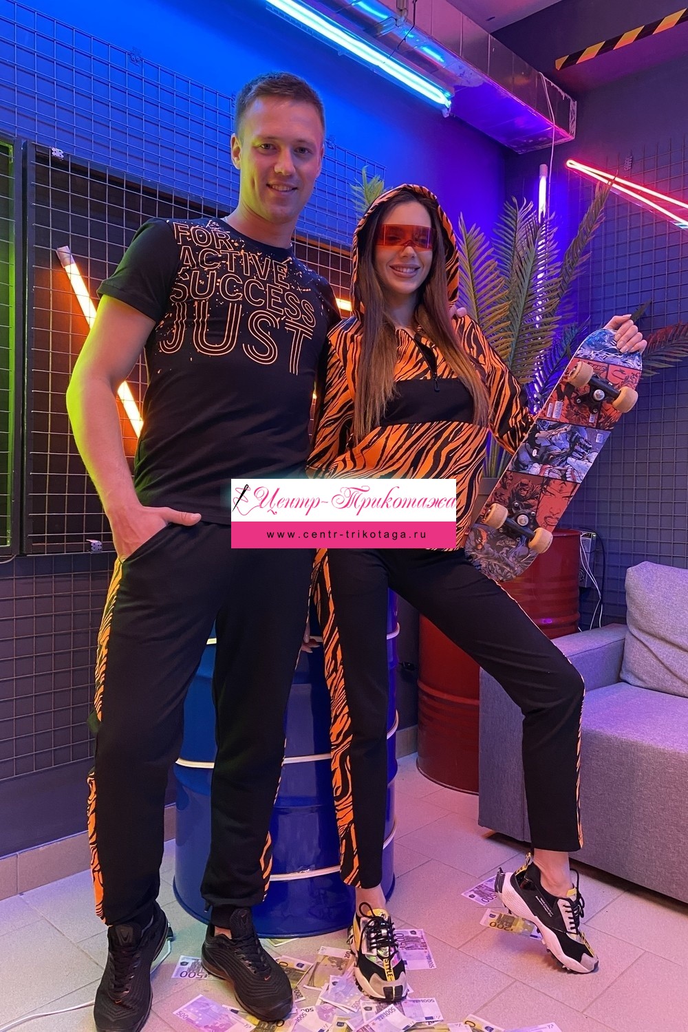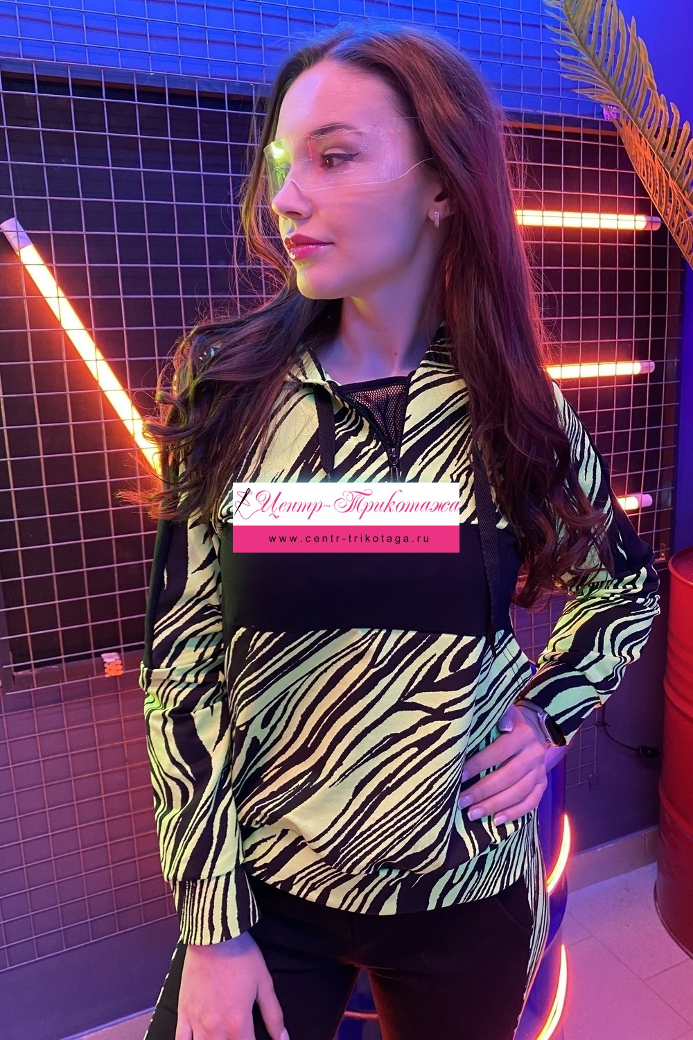 Костюм состоит из куртки и брюк. Брюки на поясе, с карманами, с лампасами из отделочного полотна вдоль боковых швов. Куртка свободная, с капюшоном, длиной до середины бедра, на поясе. Рукав втачной, длинный, со вставками из отделочного полотна, на манжете. На полочке расположен карман кенгуру . В верхней части полочки обработана молния и вставлена сетка.