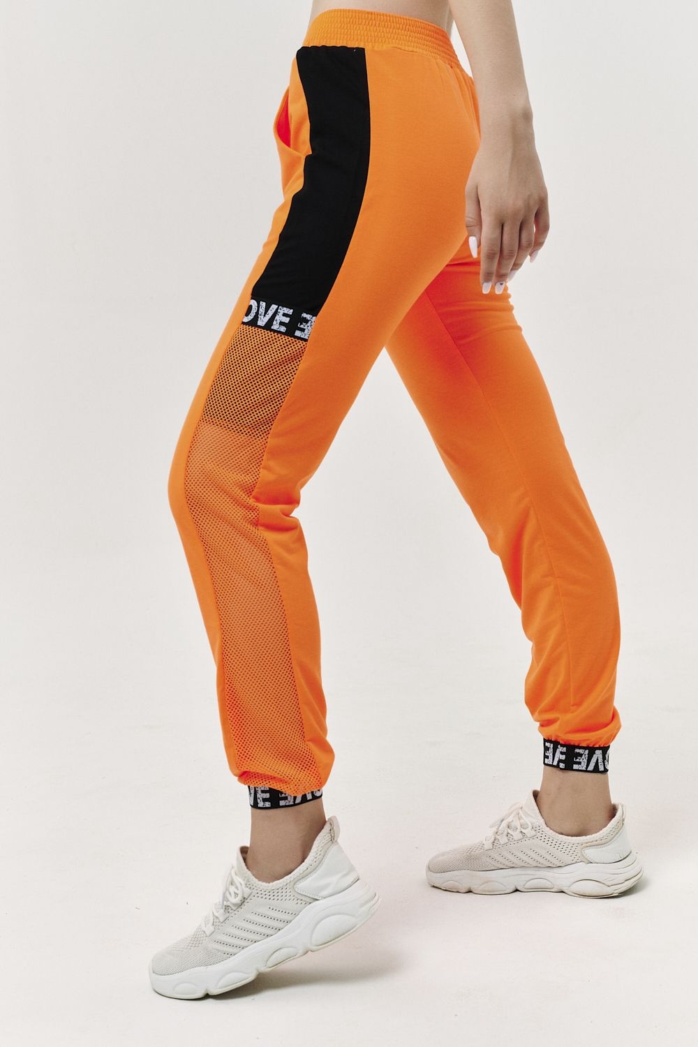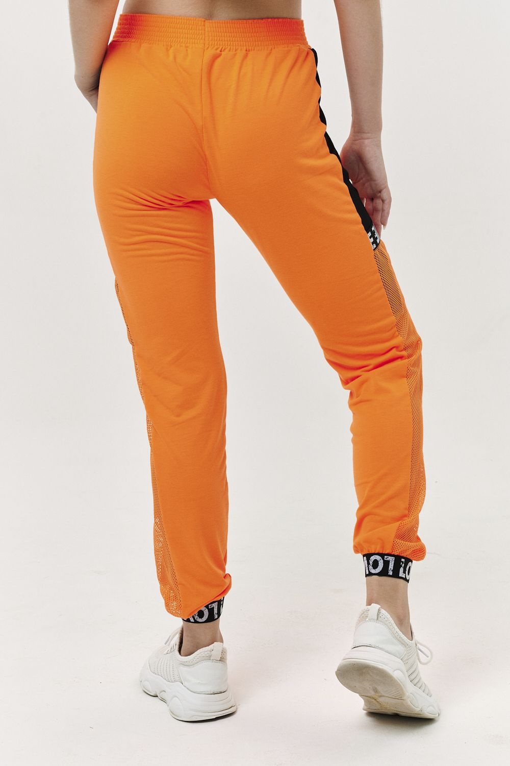 Костюм состоит из туники и брюк. Туника прямая, свободная, с капюшоном из сетки, с удлиненной спинкой. Рукав короткий, обработанный декоративной резинкой. Кокетка полочки выполнена из сетки. Вдоль центра спинки расположена декоративная вставка из отделочного полотна и сетки. Брюки свободные, длинные, с карманами, на эластичном поясе. Низ брюк обработан декоративной резинкой. Вдоль боковых швов расположен лампас из отделочного полотна и сетки. В средней части лампаса расположен карман.