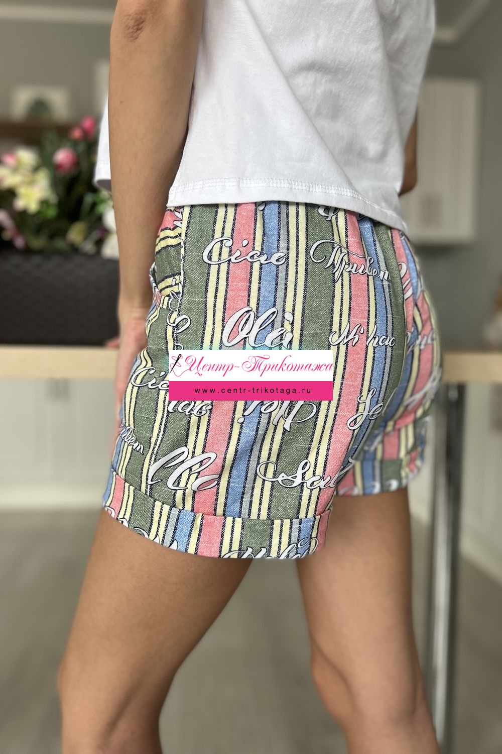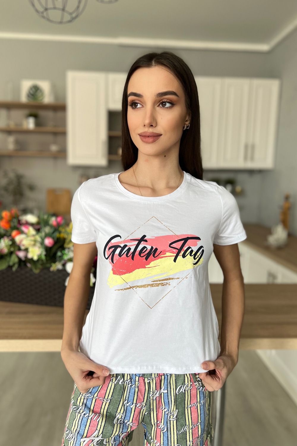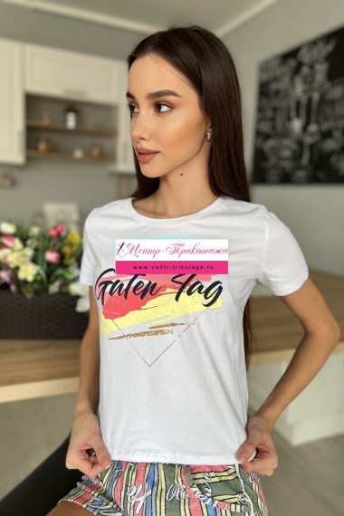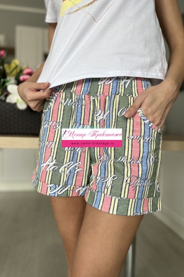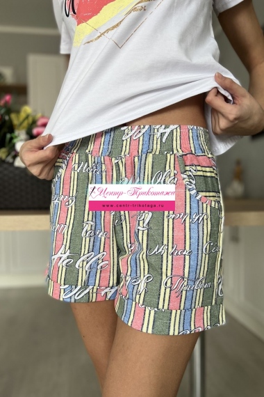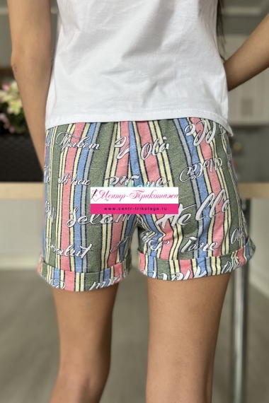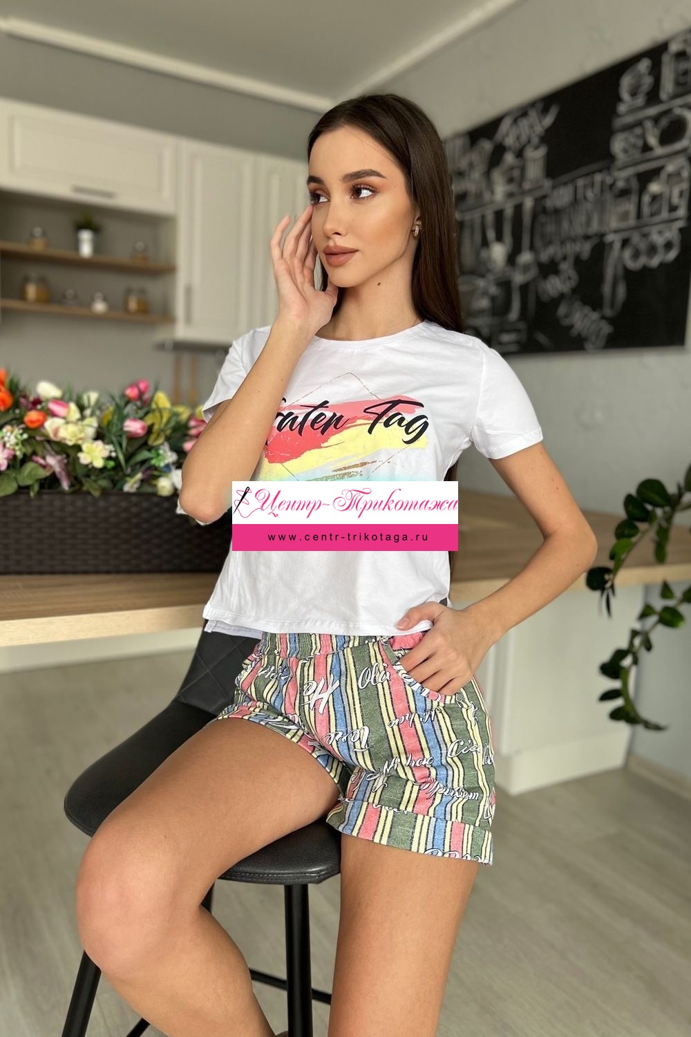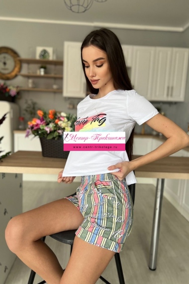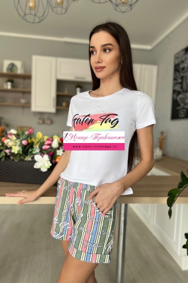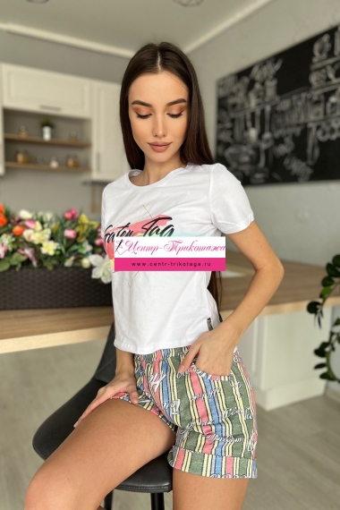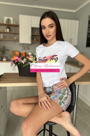 Костюм состоит из футболки и шорт. Футболка прямого силуэта, с удлиненной спинкой, с округлой горловиной. Рукав втачной, короткий. В нижней части боковых швов обработаны разрезы. Горловина обработана обтачкой из основного полотна. Шорты прямые, на поясе, с карманами, с манжетом по низу.