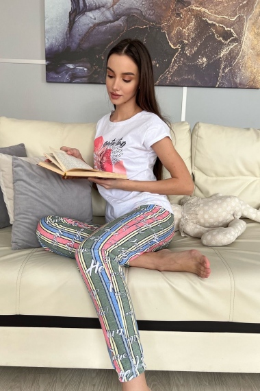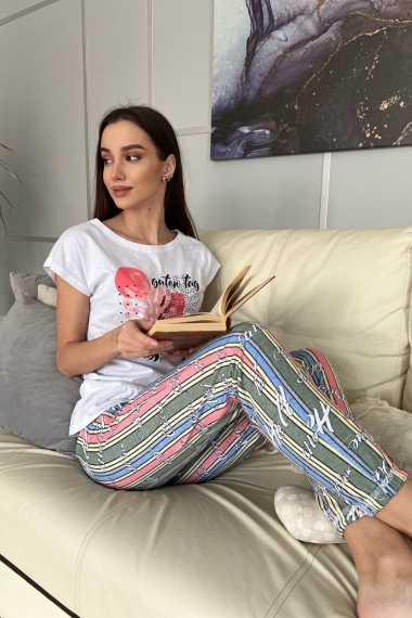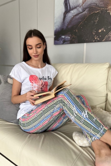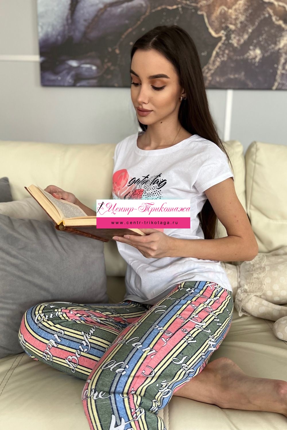 Комплект состоит из футболки и брюк. Брюки свободные, длинные, с карманами, на эластичном поясе, с резинкой по низу. Футболка полуприлегающего силуэта, с округлой горловиной, длиной до середины бедра. Рукав втачной короткий. В верхней части спинки обработан декоративный вырез. Горловина, низ рукавов и вырез на спинке обработаны бейкой из основного полотна с отделочным кантом.