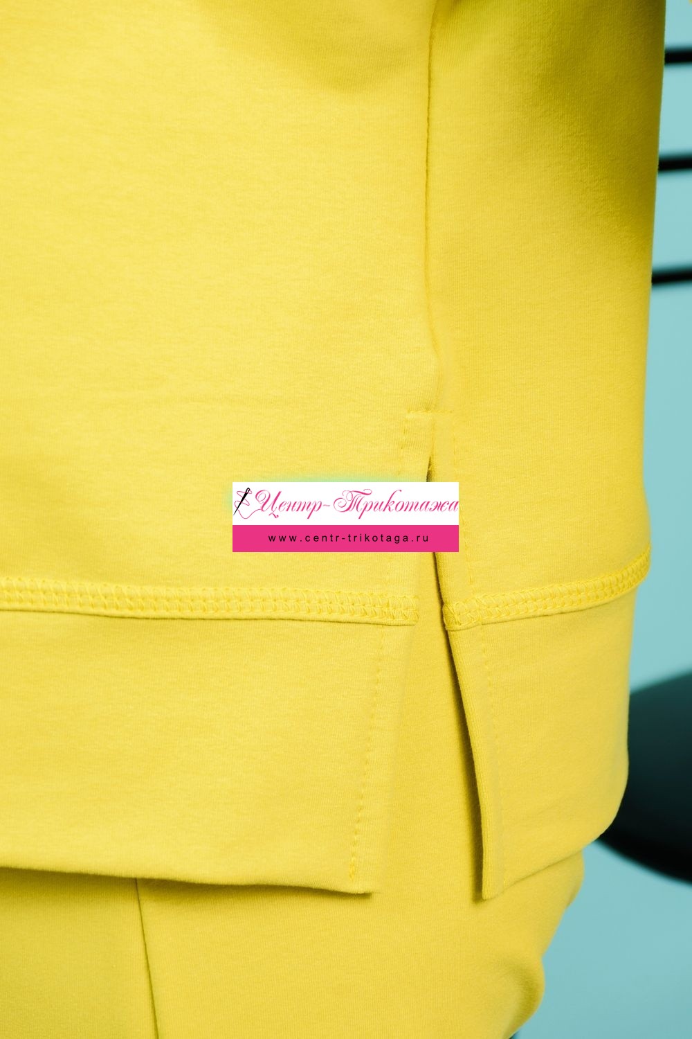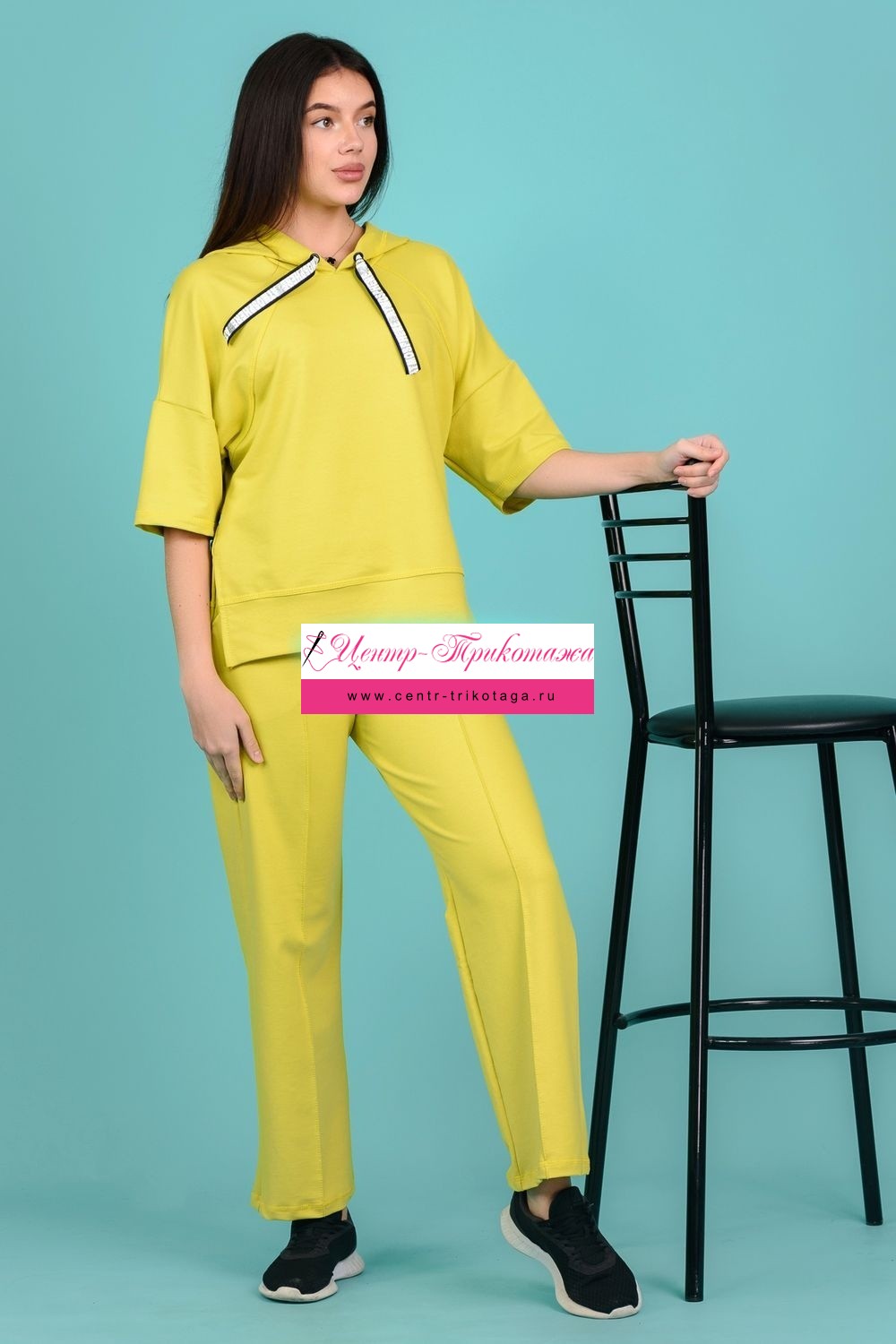 Костюм состоит из толстовки и брюк. Толстовка прямая, свободная, с капюшоном, с коротким рукавом. На полочке расположены симметричные фигурные кокетки. В нижней части боковых швов обработаны разрезы. Низ полочки и спинки завершены поясом. Брюки свободные, прямые, со стрелками, с карманами, на поясе.