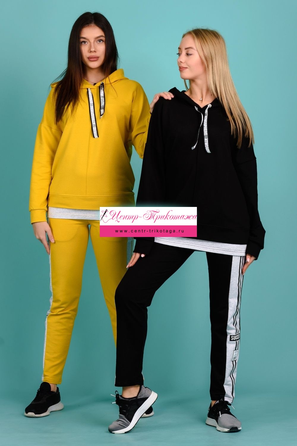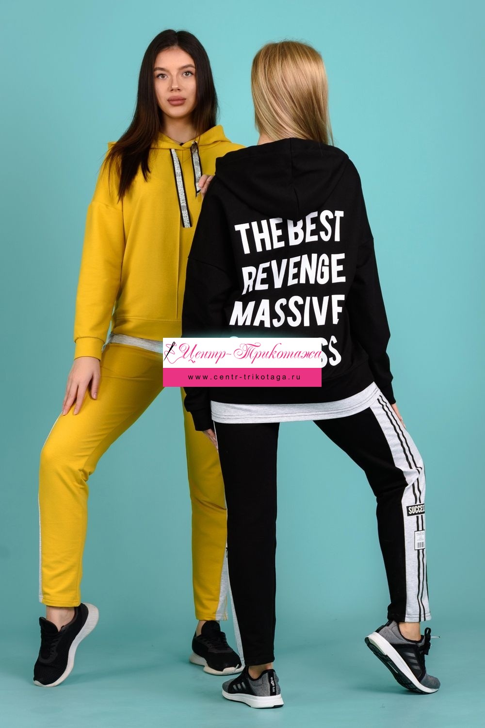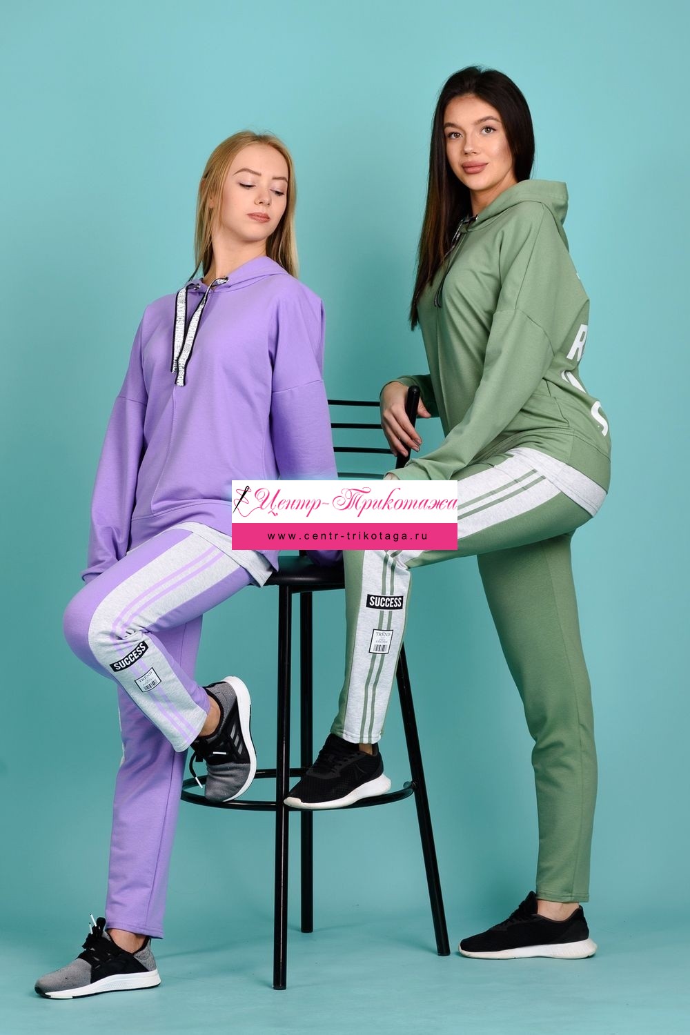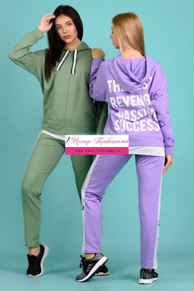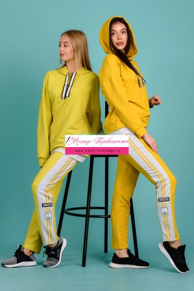Костюм состоит из толстовки и брюк. Толстовка прямая, свободная, с капюшоном, с длинным рукавом на манжете. Низ полочки и спинки завершен поясом. Брюки с карманами, на поясе. Вдоль боковых швов расположены лампасы из отделочного полотна.