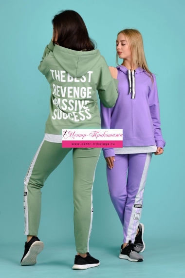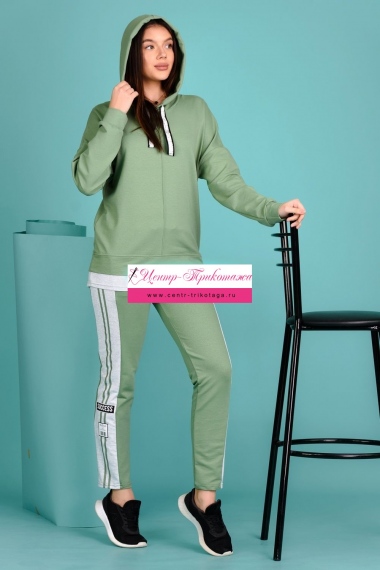 Костюм состоит из толстовки и брюк. Толстовка прямая, свободная, с капюшоном, с длинным рукавом на манжете. Низ полочки и спинки завершен поясом. Брюки с карманами, на поясе. Вдоль боковых швов расположены лампасы из отделочного полотна.