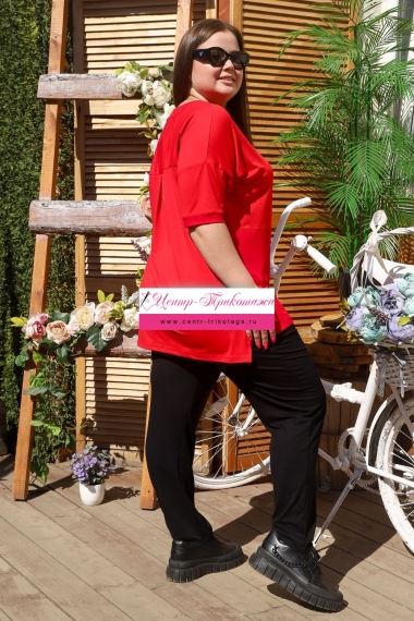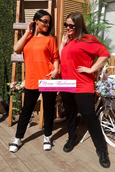 Костюм состоит из футболки и брюк. Футболка прямого силуэта, с округлой горловиной, с удлиненной спинкой, с разрезами в нижней части боковых швов. На полочке расположены вставки из отделочного полотна. Спинка с кокеткой. Рукав короткий, обработанный эластичным манжетом. Горловина обработана эластичной обтачкой. Брюки на поясе, с боковыми карманами. В верхней части передних половинок по шву притачивания пояса расположены складки. На моделях 48 и 52 размеры