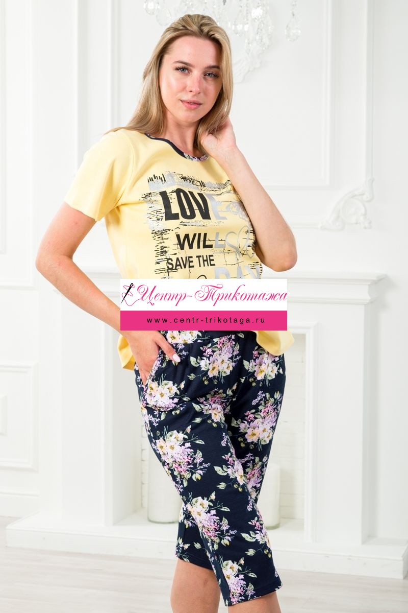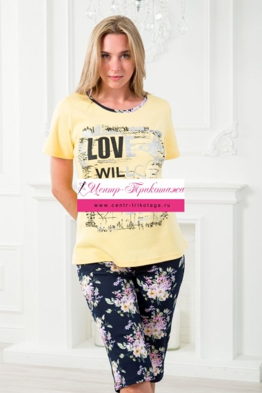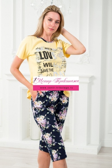 Костюм женский домашний из футболки и бридж Букетик желтый темно-синий с принтом LOVE №А-20337