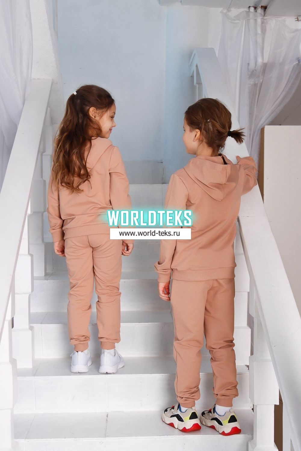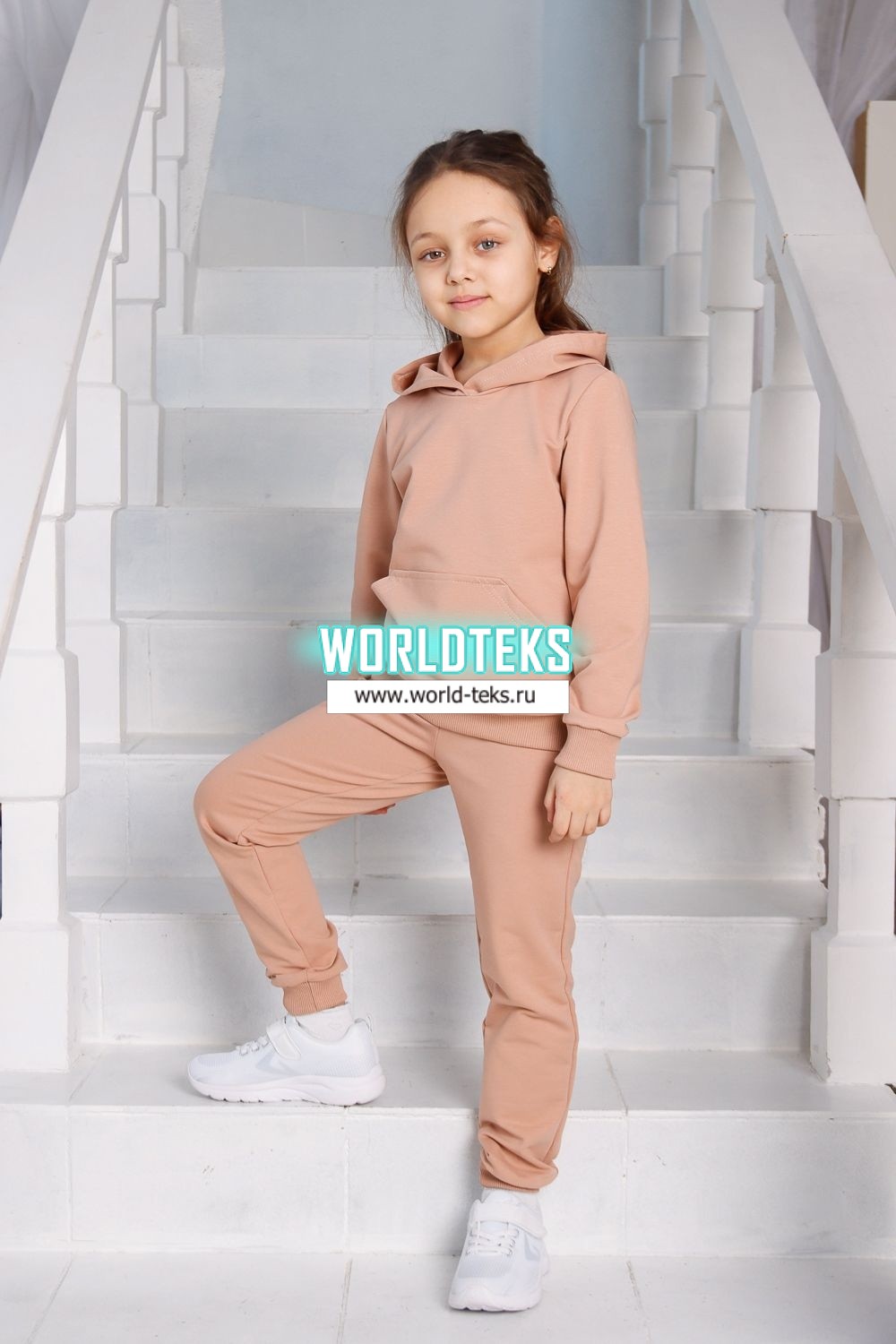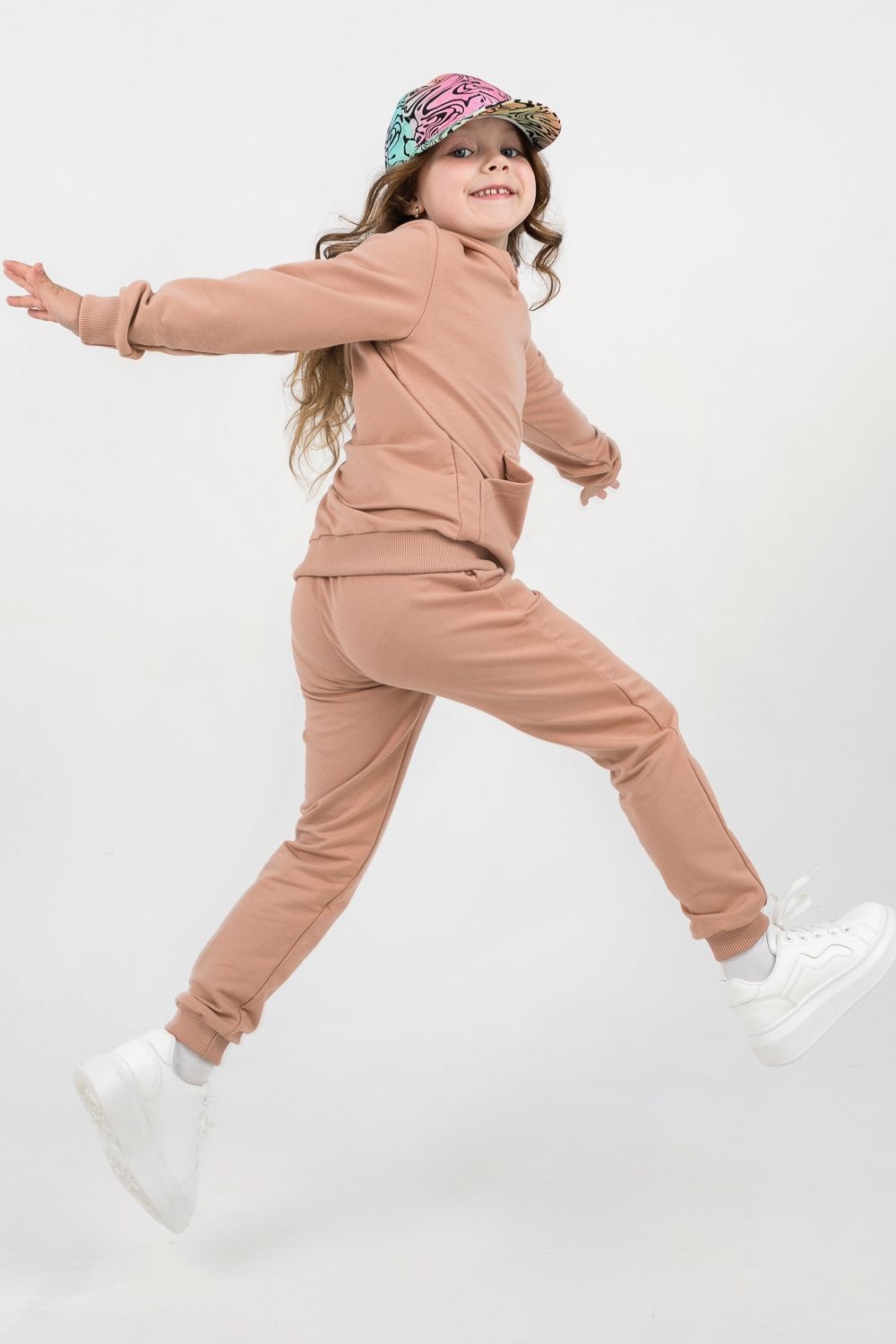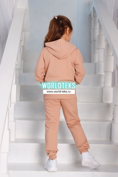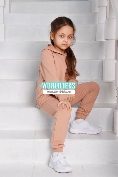 Костюм для девочек дошкольного и младшего школьного возраста. Костюм состоит из толстовки и штанов. Костюм из трикотажного эластичного хлопкового однотонного полотна футер. Толстовка с капюшоном, с длинным рукавом на манжете и поясе из основного полотна. На переде толстовки расположен карман-кенгуру. Штаны с боковыми карманами, на манжетах и поясе из основного полотна.