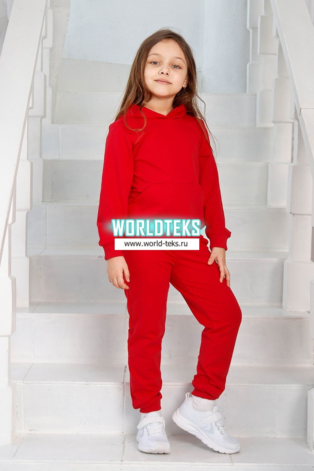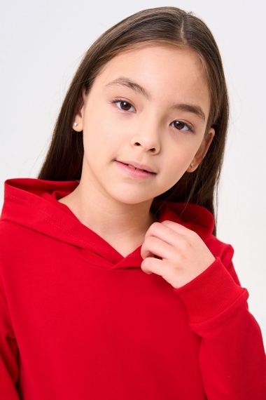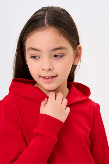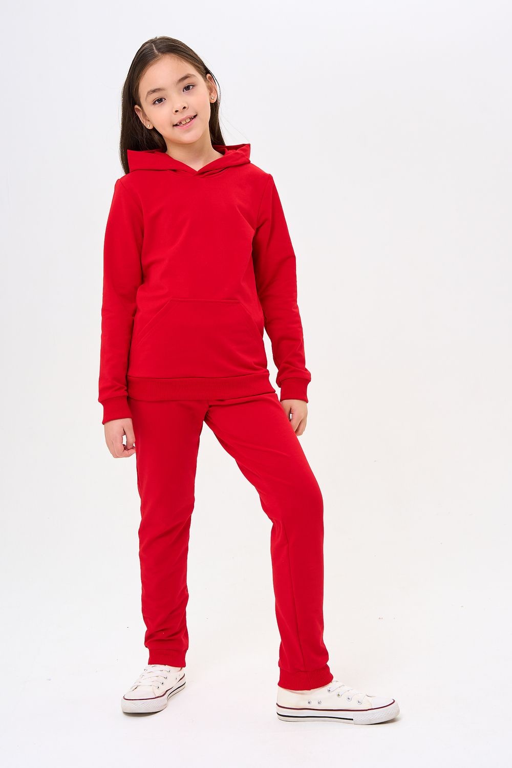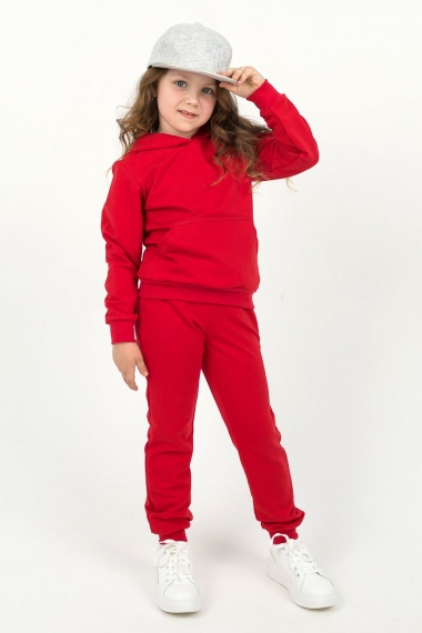 Костюм для девочек дошкольного и младшего школьного возраста. Костюм состоит из толстовки и штанов. Костюм из трикотажного эластичного хлопкового однотонного полотна футер. Толстовка с капюшоном, с длинным рукавом на манжете и поясе из основного полотна. На переде толстовки расположен карман-кенгуру. Штаны с боковыми карманами, на манжетах и поясе из основного полотна.