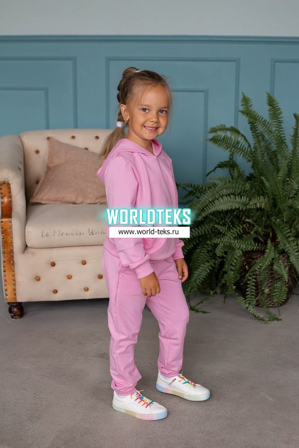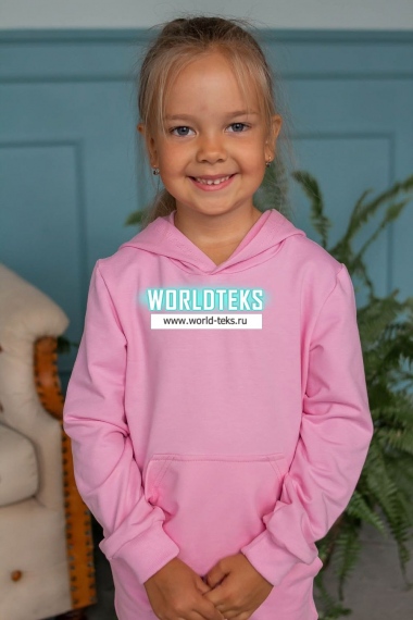 Костюм для девочек дошкольного и младшего школьного возраста. Костюм состоит из толстовки и штанов. Костюм из трикотажного эластичного хлопкового однотонного полотна футер. Толстовка с капюшоном, с длинным рукавом на манжете и поясе из основного полотна. На переде толстовки расположен карман-кенгуру. Штаны с боковыми карманами, на манжетах и поясе из основного полотна.