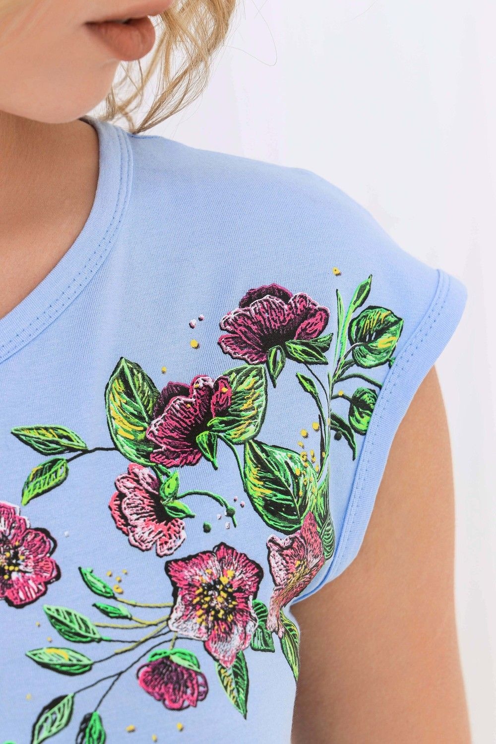 Костюм с шортами. Футболка свободного покроя из вискозы. Шорты с карманами из кулирки, цвет-джинс. Пояс широкий 4 см. Принт-имитация вышивки. Подходит для повседневного использования.