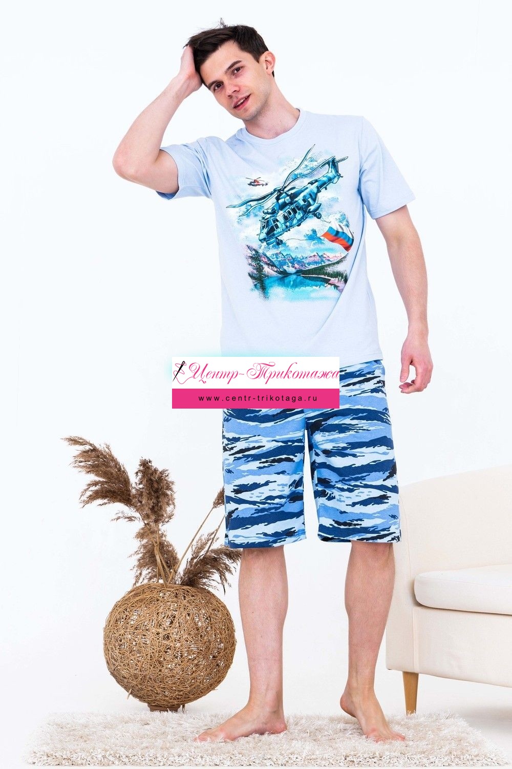 Мужской костюм из кулирки футболка + шорты. Светлая футболка с принтом в виде изображения вертолета. Шорты в дизайне «милитари», по бокам карманы, длина чуть ниже коленей. Рисунок камуфляжа может немного отличаться
