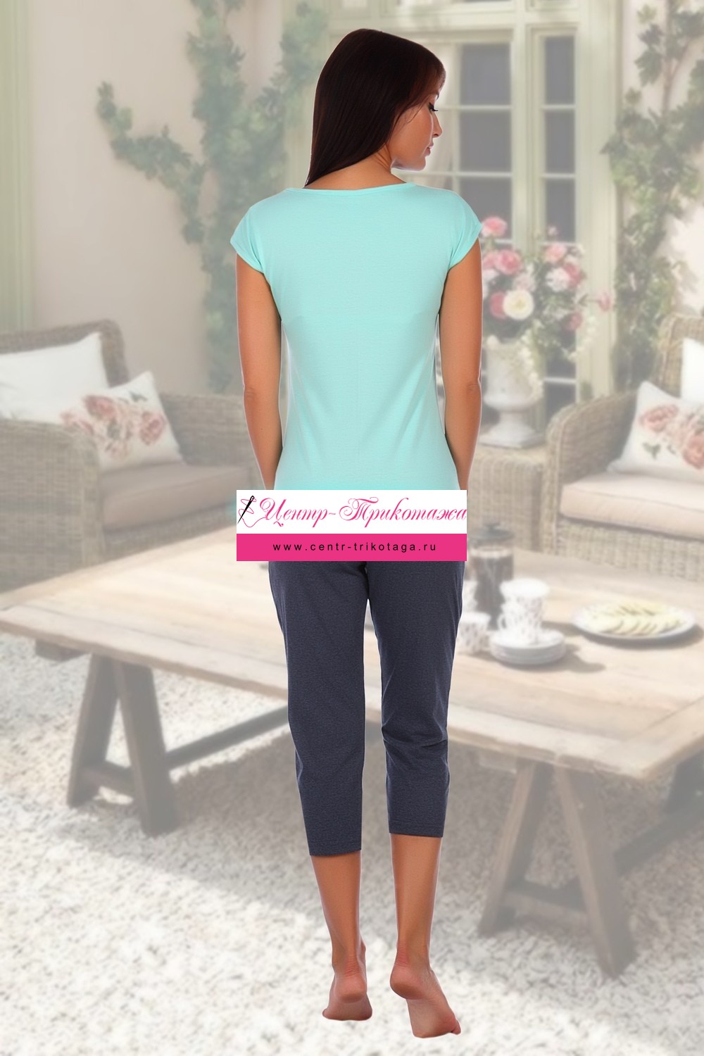 Костюм универсален: его можно носить дома, на любимой даче и как на дневной променад. Бриджи-капри заужены к низу, на поясе с широкой простроченной резинкой 3см. Свободный крой на уровне бёдер и живота, благодаря кокетке на поясе и складкам. Длина до середины икры. Благодаря хорошему составу 50% хб и 50% пэ бриджи не растянутся на коленях. Футболка оформлена полноцветной печатью, поэтому ягоды кажутся натуральными. Горловина-лодочка. Очень удобный крой. Оттенок ткани бриджей может отличаться от представленного на фото