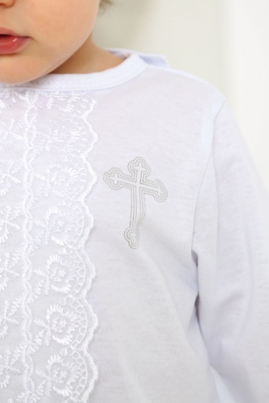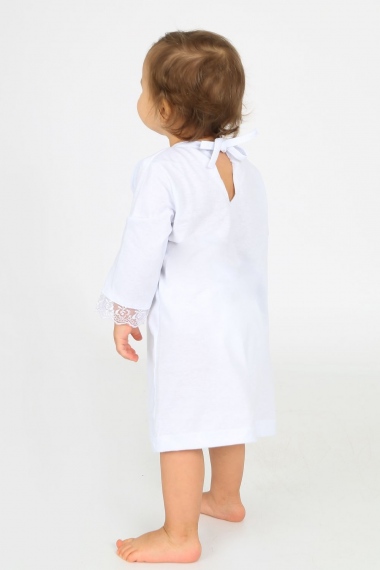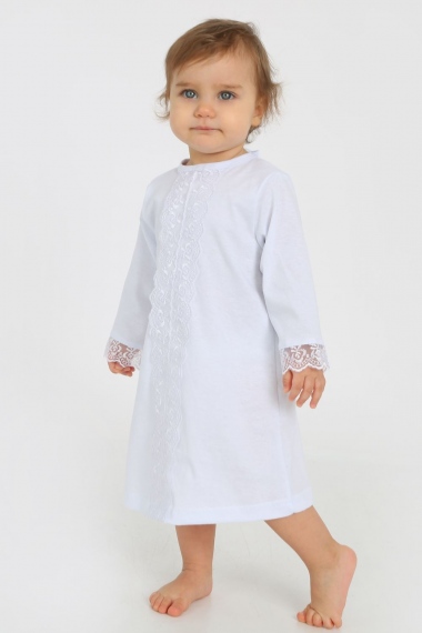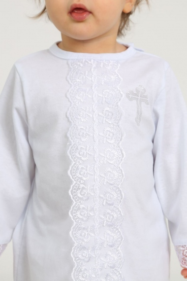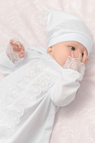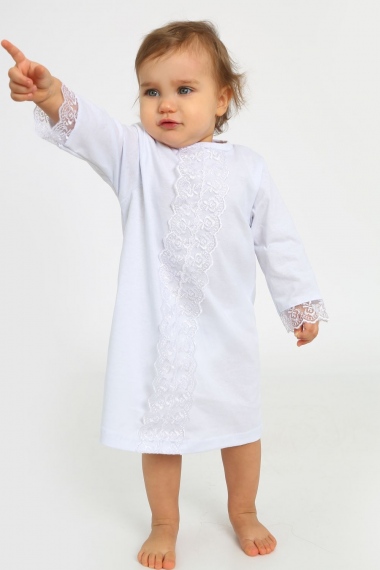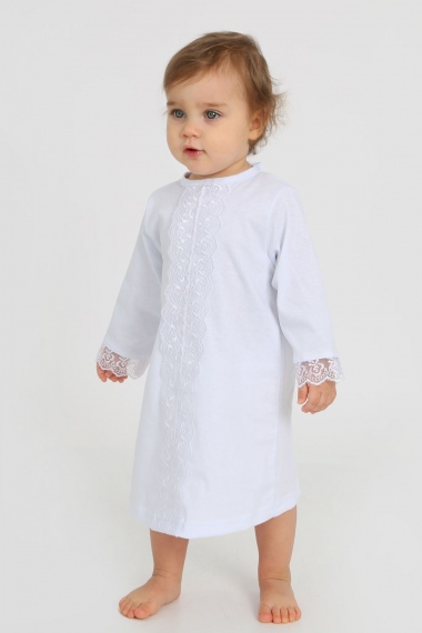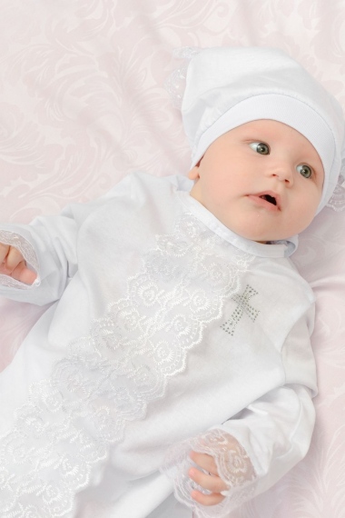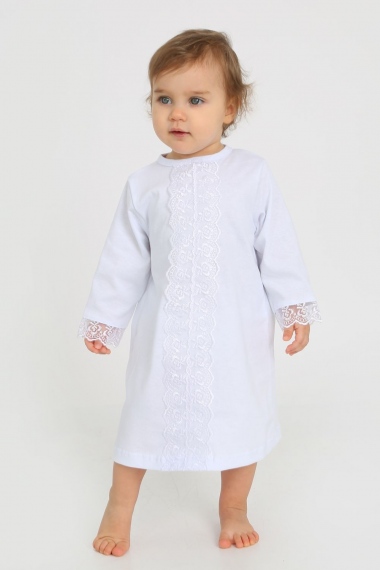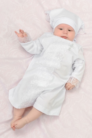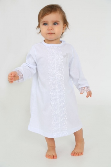 Крестильный набор для девочки Белоснежное платье, украшено белым красивым кружевом и серебряным крестиком и косынка с кружевом на трикотажной манжете. Отличный вариант для первого торжества - таинства крещения. Выполнен из мягкой и приятной на ощупь трикотажной ткани, которая подарит максимальный комфорт в ваш светлый праздник. Длина платья от плеча до низа Рост 62-43см,68-45см,74-47см, 80-50см, 86-53см,92-56 см
