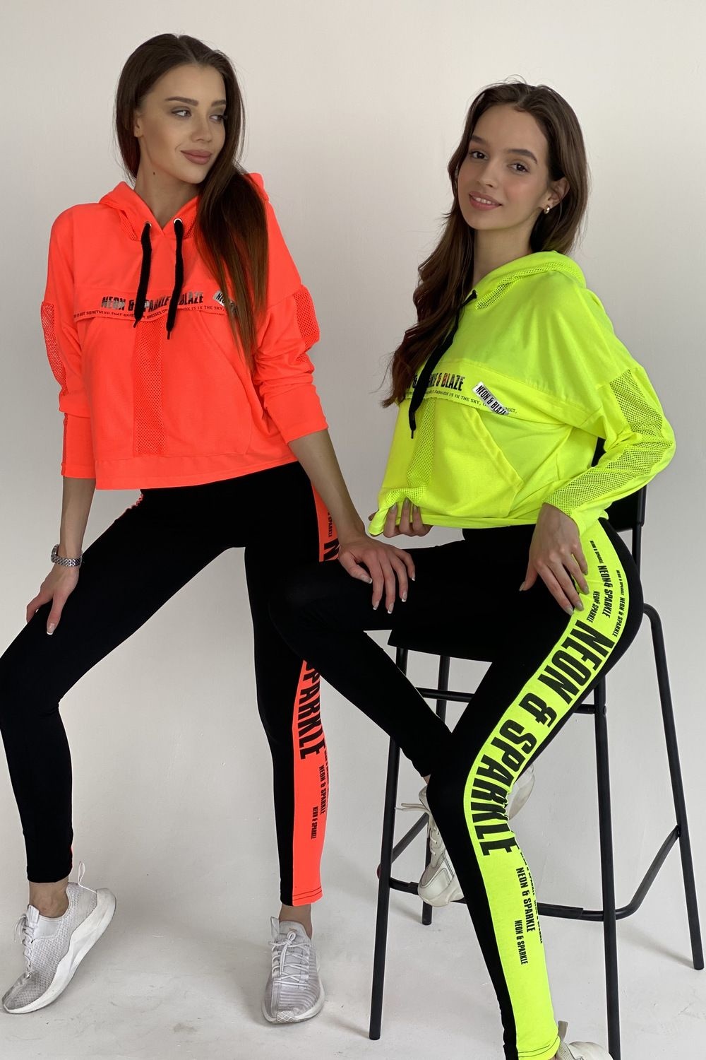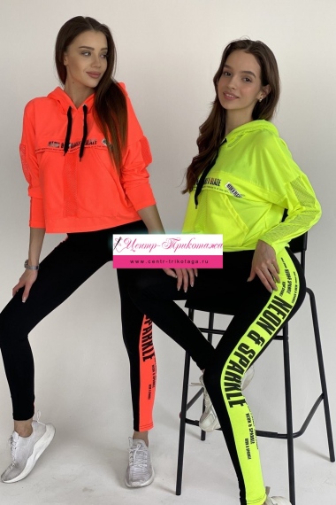 Лосины облегающие, длинные, сверху на резинке. Вдоль боковых швов расположен лампас из отделочного полотна.