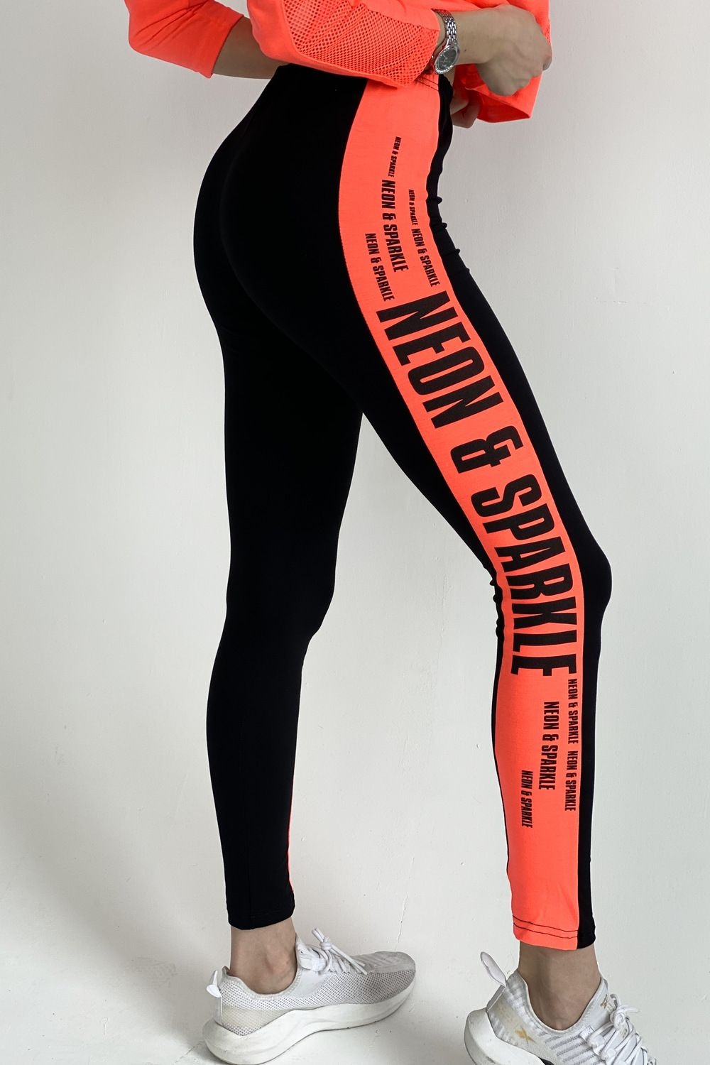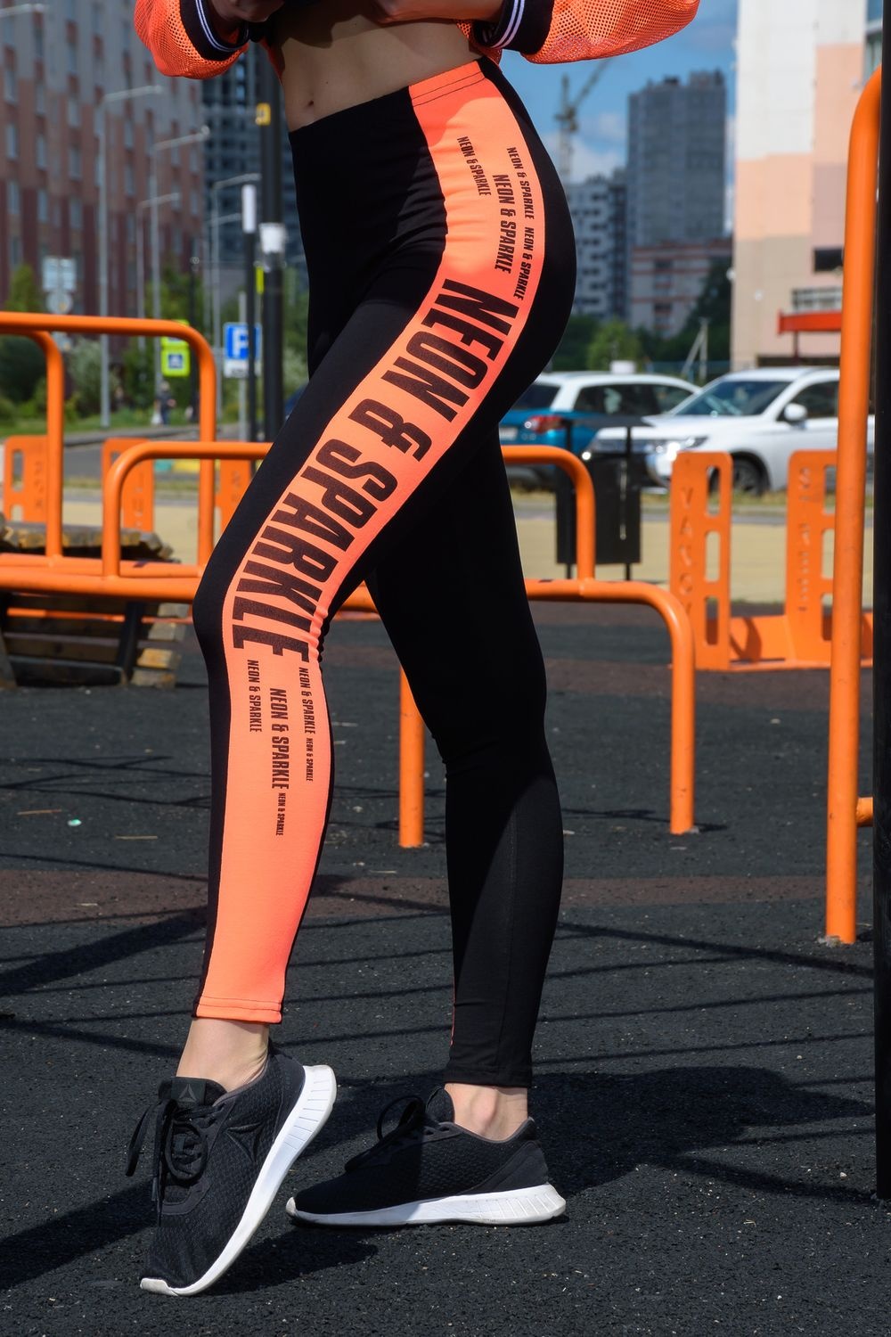 Лосины облегающие, длинные, сверху на резинке. Вдоль боковых швов расположен лампас из отделочного полотна.