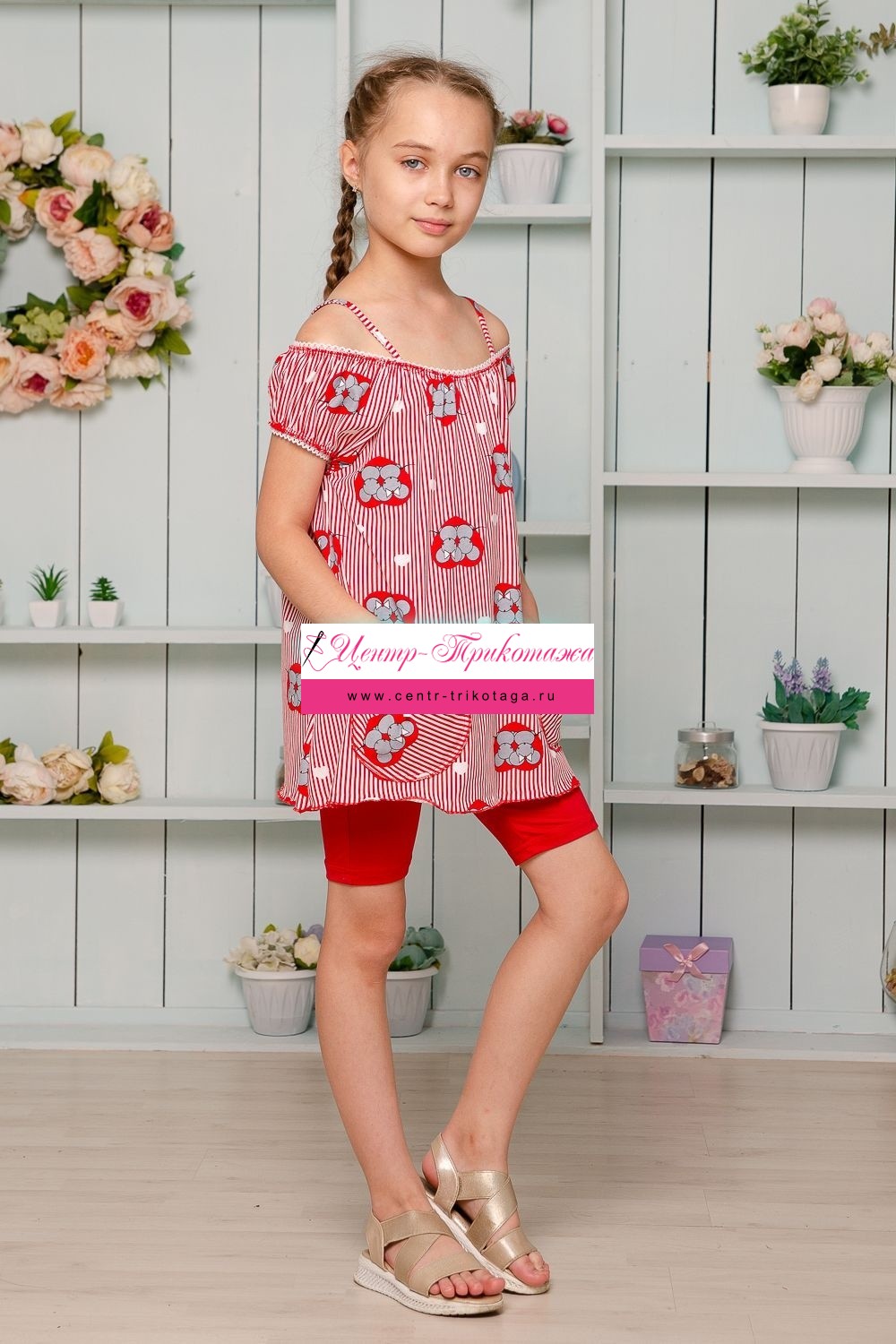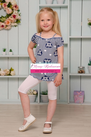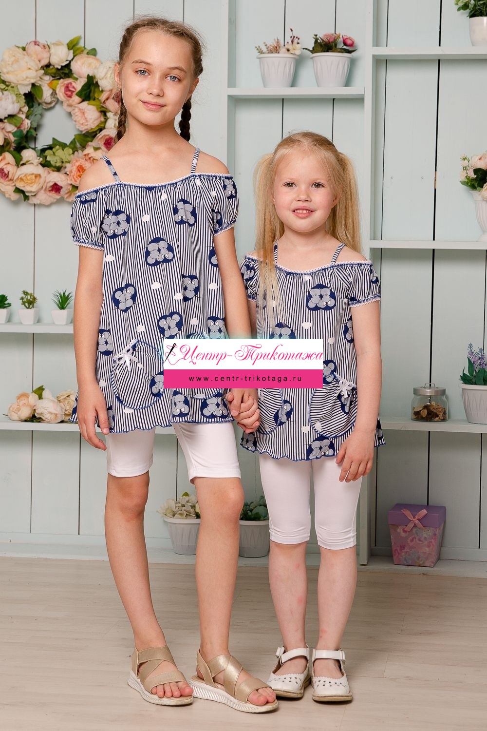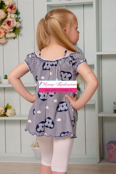 Майка детская летняя. Свободного А-силуэта на тонких бретелях. С двумя декоративными кармашками, на которых настрочены бантики из атласной ленты. Горловина и рукава собраны на кружевную резинку. Все срезы в изделии обработаны декоративной краеобметочной строчкой.