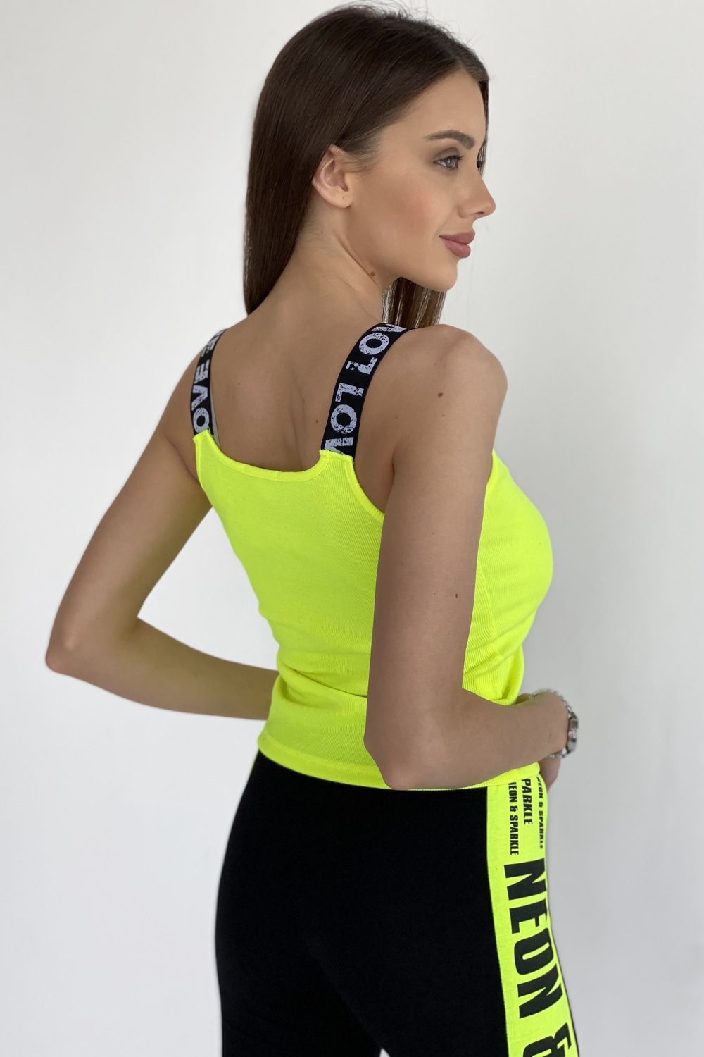 Майка облегающая, средней длины, с округлой горловиной. Размер регулируется за счет эластичности полотна. Бретели выполнены из эластичной тесьмы с надписями. Горловина и проймы обработаны бейкой из основного полотна.