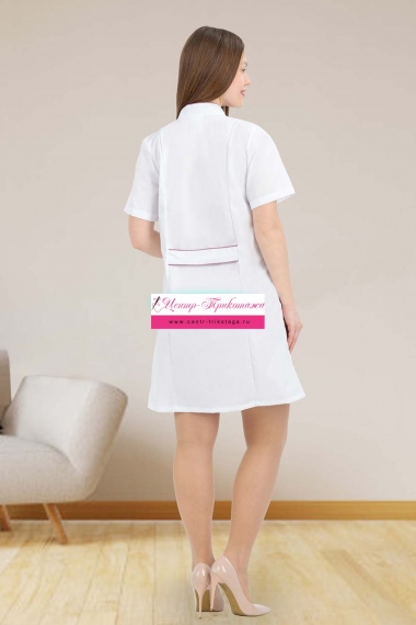 Халат медицинский Силуэт приталенного силуэта, длиной чуть выше колена. Полочка с рельефными швами, с боковыми и нагрудным карманами. На спинке пояс-хляст. Вырез горловины фигурный, с воротником-стойкой. Застегивается на молнию спереди.