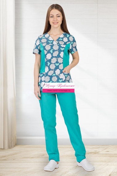Костюм состоит из трикотажной комбинированной футболки с оригинальным дизайном и однотонных брюк. Рельефы футболки выполнены из контрастной ткани в цвет брюк. Полочка с кокеткой, V-образным вырезом горловины, двумя накладными карманами. Рукав короткий, втачной, одношовный. Брюки прямые на притачном поясе, состоящем из двух частей, стянутый эластичной тесьмой.
