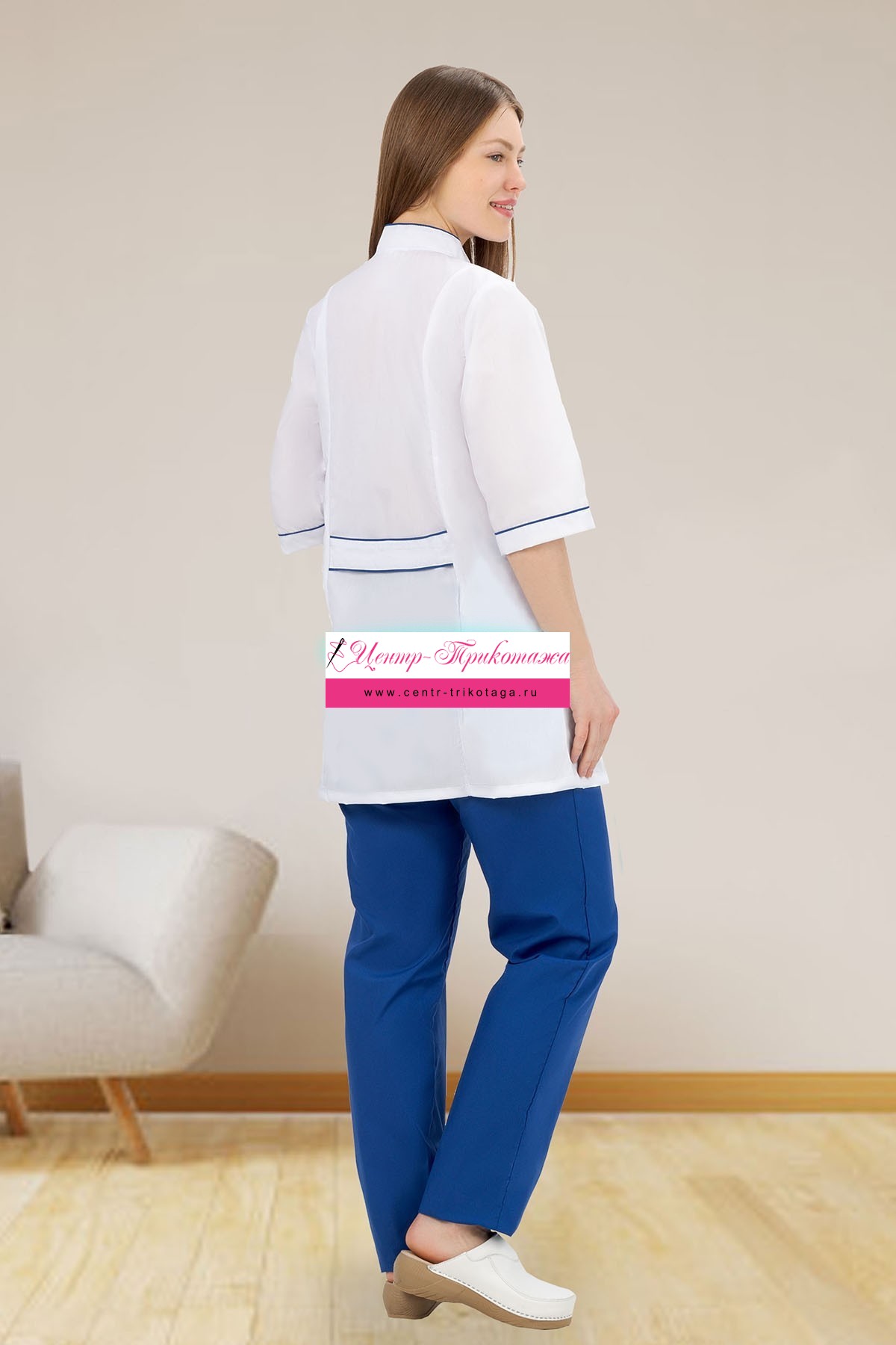 Костюм медицинский Силуэт состоит из куртки и брюк. Куртка прилегающего силуэта, длиной до бедер. На спинке пояс-хляст. Рукава короткие. Брюки прямые, на резинке.