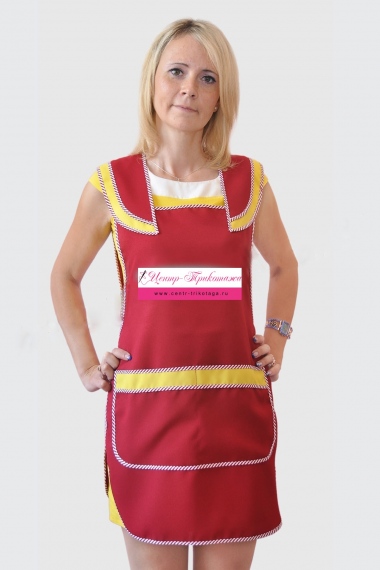 Фартук средней длины, перекидной, имеющий спинку без отделки и полочку с отрезными симметричными кокетками, нижний слой которых выполнен из отделочной ткани. В нижней центральной части полочки расположен вместительный карман с двумя отделениями, декорированный планкой из отделочной ткани. Объем фартука регулируется завязками-поясами, все срезы фартука обработаны кантом из капроновой ткани. Фартук предназначен для защиты от общепроизводственных загрязнений.