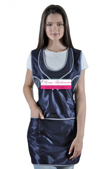 Фартук Фантазия средней длины, перекидной. Спинка и полочка с отрезными кокетками выполнена из дышащего материала – сетки, что придает дополнительный комфорт при использовании фартука в условиях повышенных температур. Кокетка полочки с округлым вырезом и симметричными фигурными накладными деталями из основного материала. В нижней части полочки расположен вместительный карман с тремя отделениями. Объем фартука регулируется завязками-поясами, все срезы фартука обработаны износостойким кантом из нейлоновой ткани. Фартук предназначен для защиты от обще-производственных загрязнений.