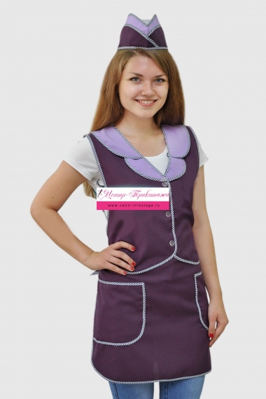 Фартук средней длины, перекидной, имеющий спинку без отделки и полочку, верхняя отрезная часть которой имитирует жилет с застежкой на три пуговицы и имеет фигурный воротник из контрастной ткани. В нижней части полочки расположены два вместительных боковых кармана. Объем фартука регулируется завязками-поясами, все срезы фартука обработаны кантом из капроновой ткани. Фартук предназначен для защиты от общепроизводственных загрязнений.