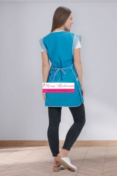 Фартук средней длины, перекидной. Спинка без отделки. Полочка с круглым вырезом горловины. Боковые части полочки отрезные, с накладными деталями, имитирующими воротник, объемными нижними карманами с элементами из отделочной ткани и планками формы крыло. Объем фартука регулируется завязками-поясами, все срезы изделия обработаны износостойким кантом из смесовой ткани. Фартук предназначен для защиты от общепроизводственных загрязнений.