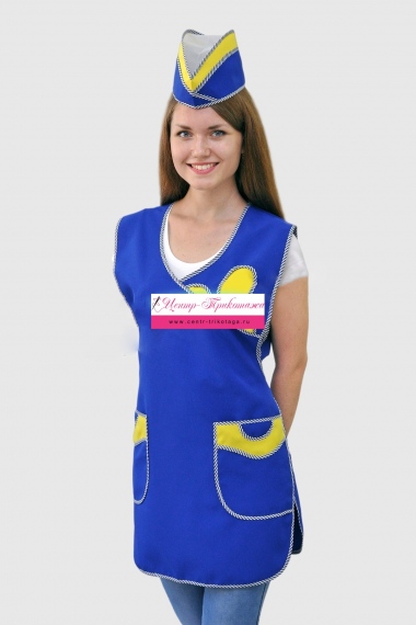 Фартук средней длины, перекидной. Спинка без отделки, полочка с отрезной асимметричной кокеткой, нижний слой которой выполнен из ткани контрастного цвета, а верхний с фигурным вырезом в виде лепестков. В нижней части полочки расположены два вместительных боковых кармана, декорированных элементами из отделочной ткани. Объем фартука регулируется завязками-поясами, все срезы фартука обработаны кантом из капроновой ткани. Фартук предназначен для защиты от общепроизводственных загрязнений.