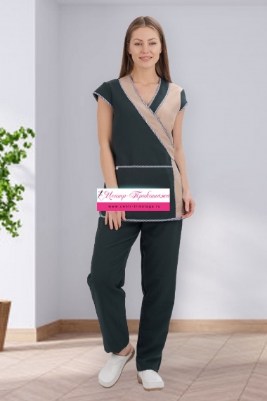 Костюм состоит из куртки и брюк. Куртка запашная, укороченная, прямого силуэта с короткими рукавами формы «крыло». Полочки декорированы отделочными элементами из контрастной ткани, в нижней части расположен вместительный карман с двумя отделениями. Спинка прямая без отделки, с двумя полу-поясами для регулировки объема. Все срезы костюма окантованы капроновым кантом. Брюки прямые, на резинке. Костюм предназначен для работников сферы обслуживания, а также защиты от обще-производственных загрязнений.