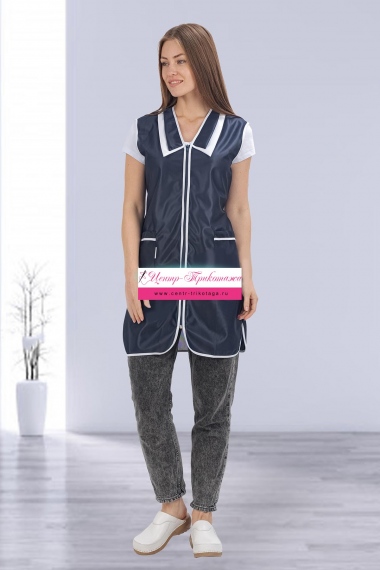 Сарафан женский укороченный прямого силуэта с центральной застежкой на молнию. Полочка с двумя нижними накладными карманами и разрезами по боковым швам. Нижний слой отложного полуворотника выполнен из контрастной ткани. Спинка без отделки, объем талии регулируется полупоясами. Все детали сарафана обработаны износостойким кантом. Сарафан предназначен для защиты от общепроизводственных загрязнений.