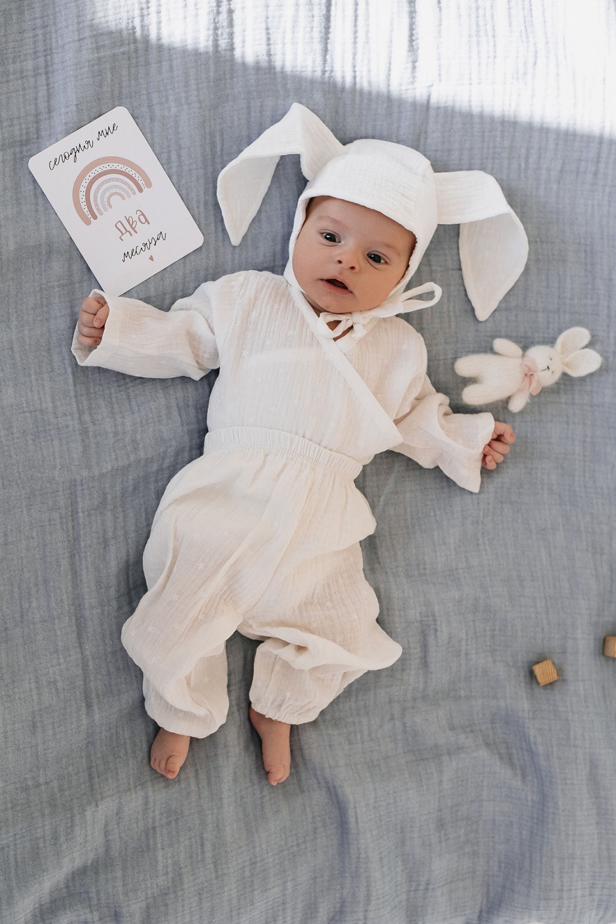 Комплект состоит из 3 предметов: распашонка с боковой застежкой, брючки, шапочка с оригинальными ушками.
