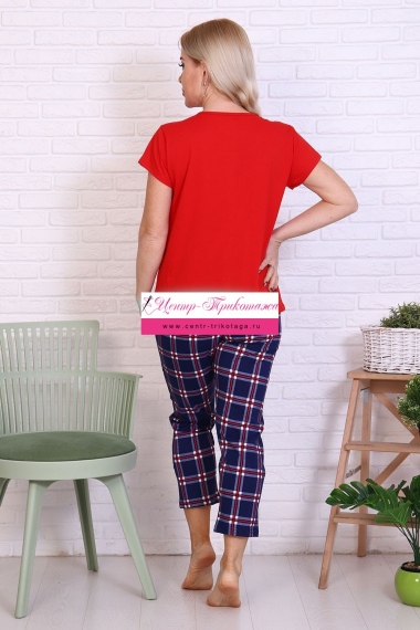 Женская пижама с укороченными брюками в клеточку. Футболка красного цвета с коротким рукавом, на полочке оригинальная печать в виде буквы с короной.
