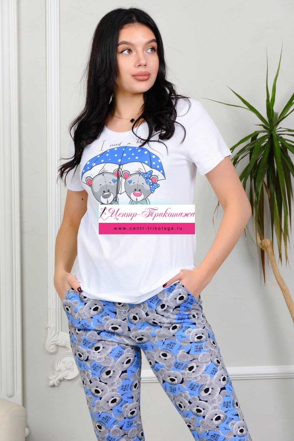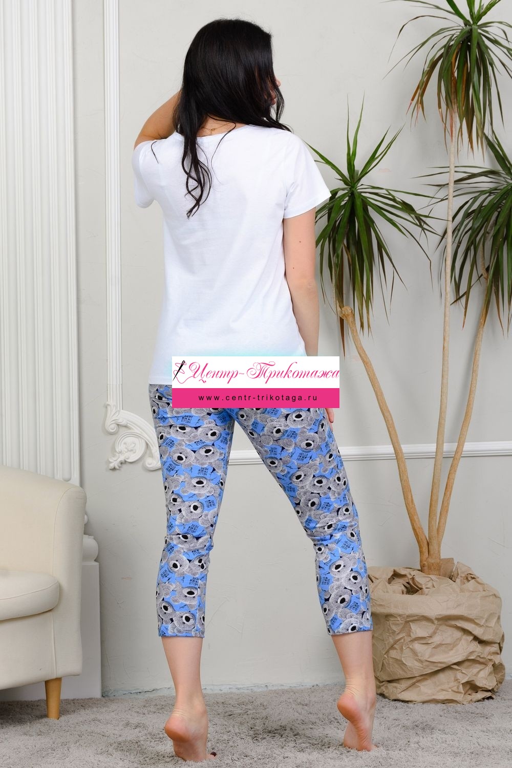 Удобный хлопковый костюм для дома и дачи. Футболка не стесняет движений, на полочке милый принт. Брючки с завышенной талией с кармашками длиной 3/4. Прекрасный комплект для каждодневного использования.